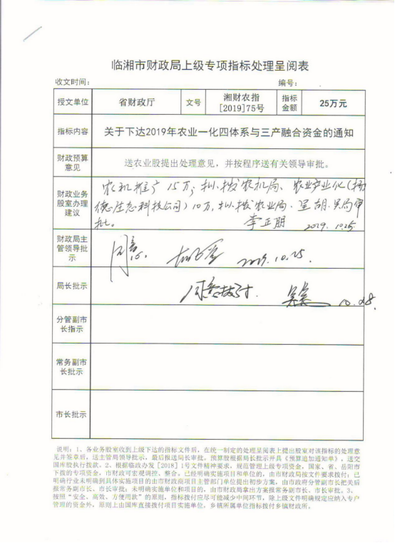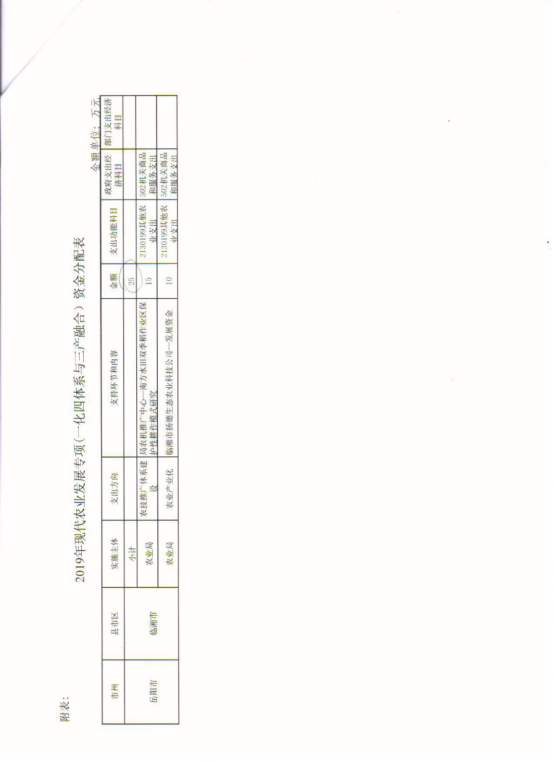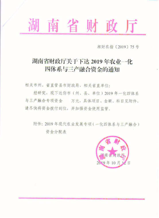 湖南省财政厅关于下达2019年农业一化四体系与三产融合资金的通知