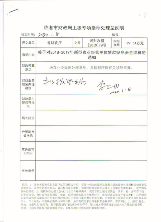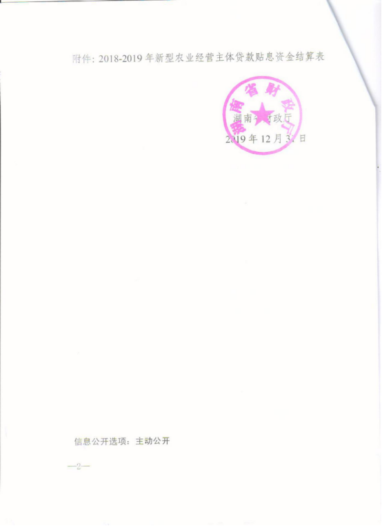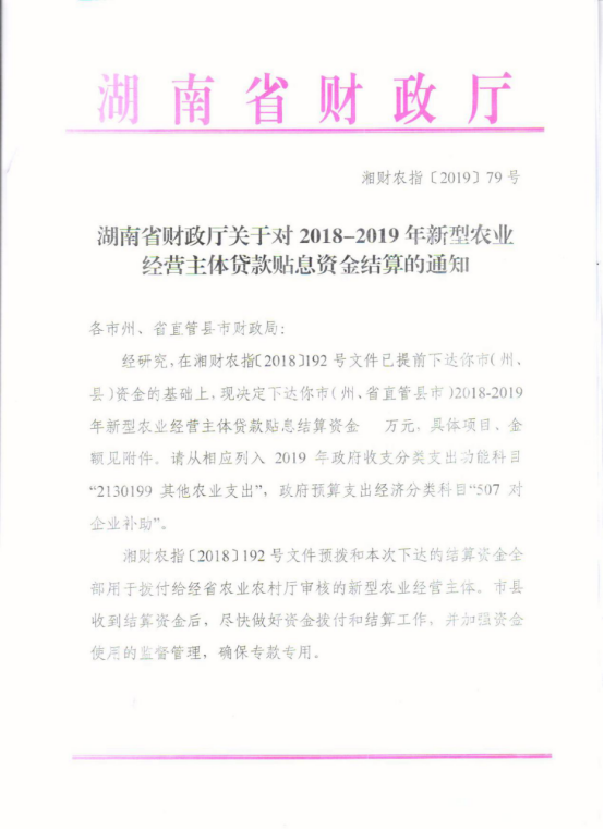 湖南省财政厅关于对2018-2019年新型农业经营主体贷款贴息资金结算的通知