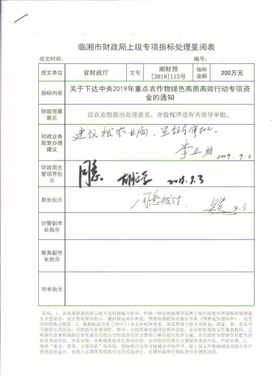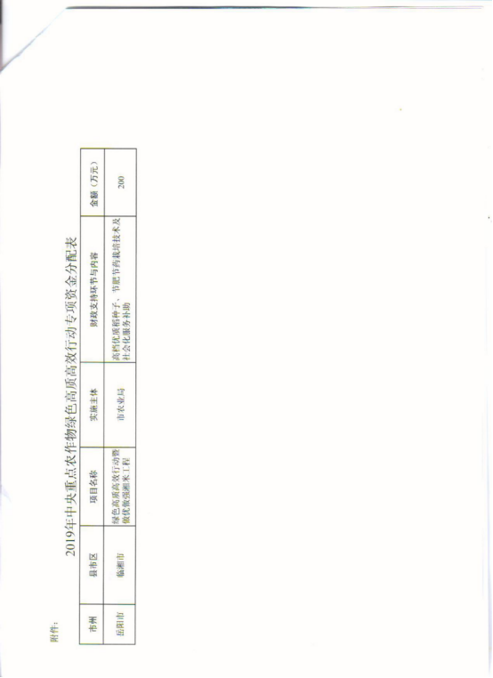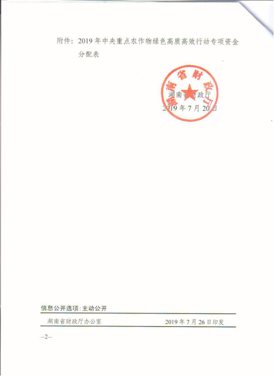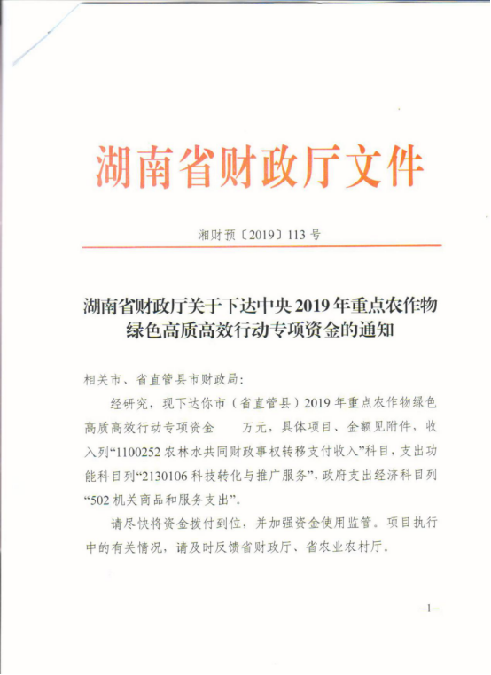 湖南省财政厅关于下达2019年重点农作物绿色高质高效行动专项资金的通知