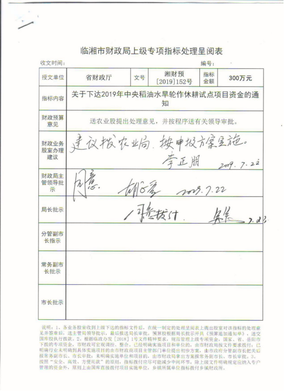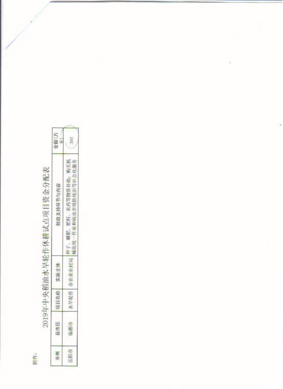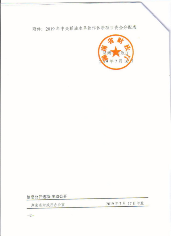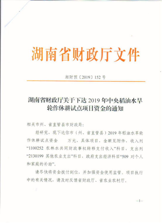 湖南省财政厅关于下达2019年中央稻油水旱轮作耕试点项目资金的通知