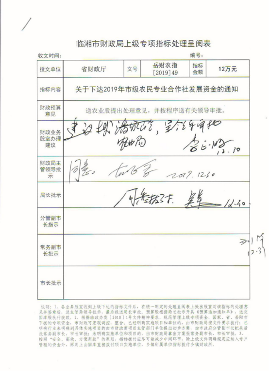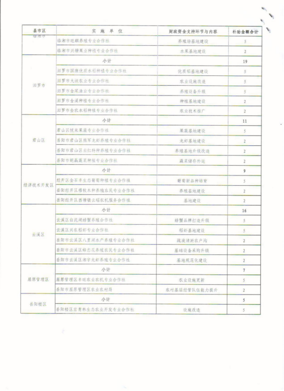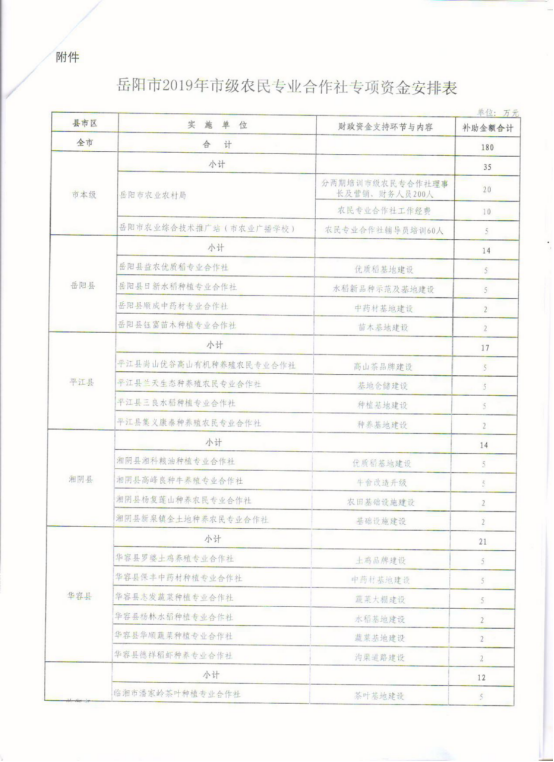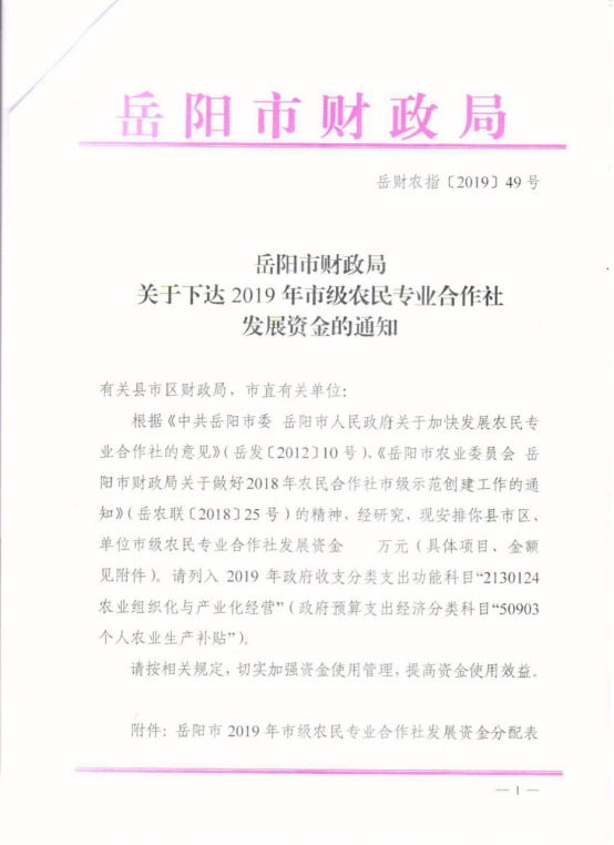 岳阳市财政局关于下达2019年市级农民专业合作社发展资金的通知