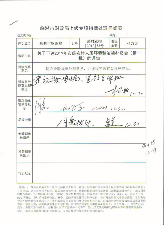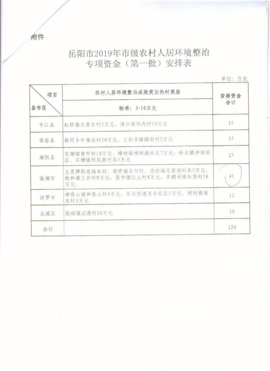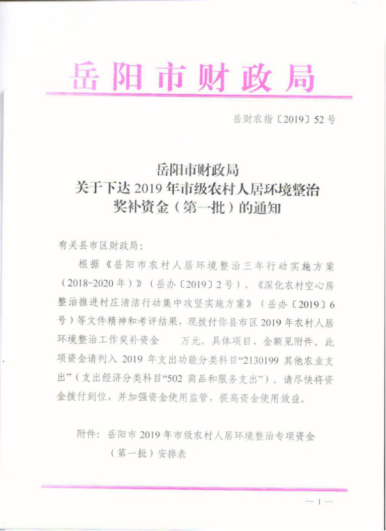岳阳市财政局关于下达2019年市级农村人居环境整治奖补资金(第一批)的通知