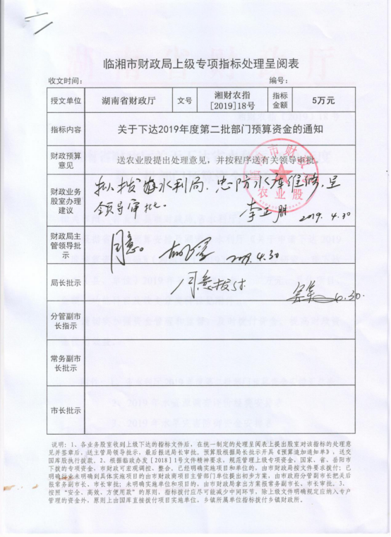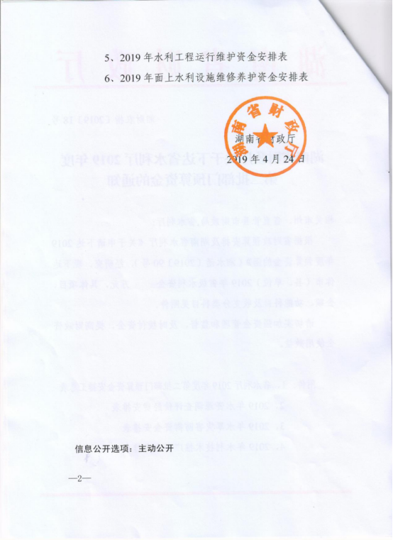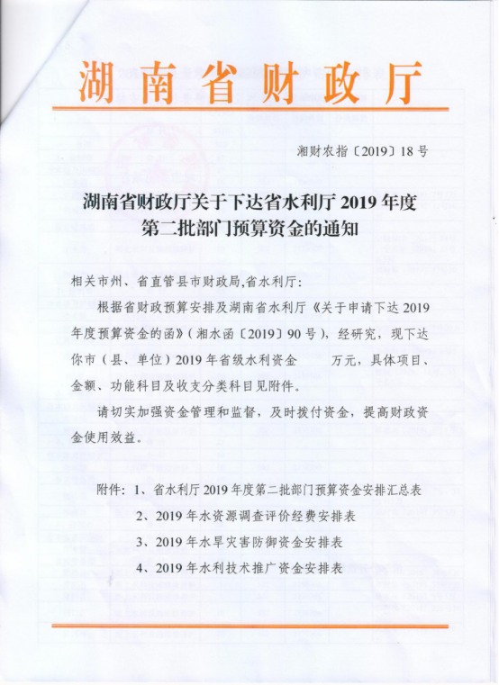 湖南省财政厅关于下达省水利厅2019年度第二批部门预算资金的通知
