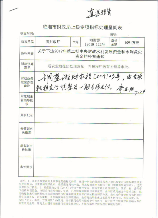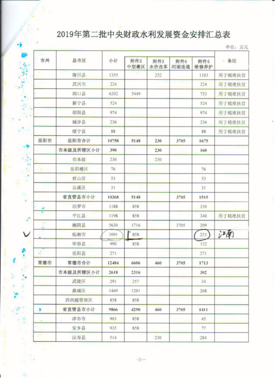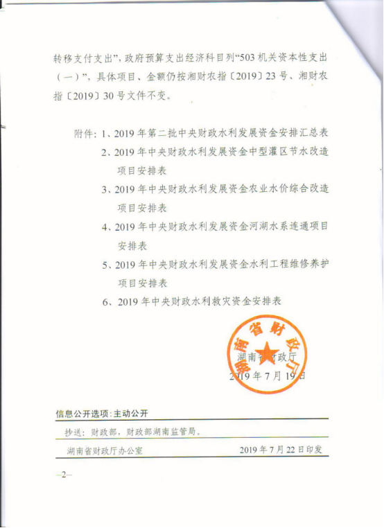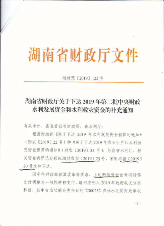 湖南省财政厅关于下达2019年第二批中央财政水利发展资金和水利救灾资金的补充通知