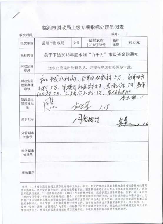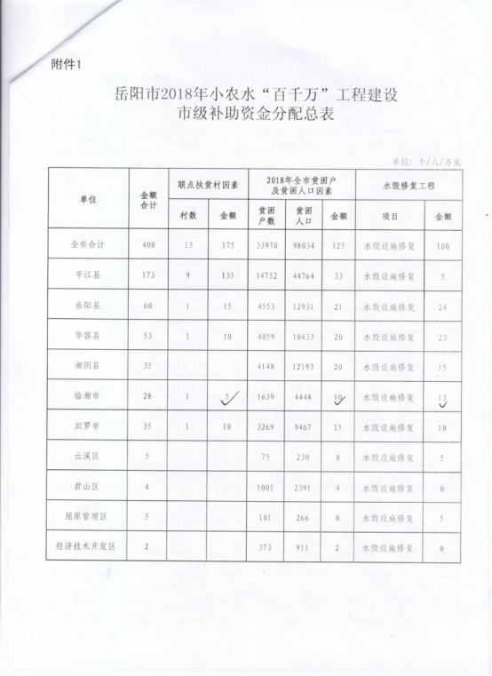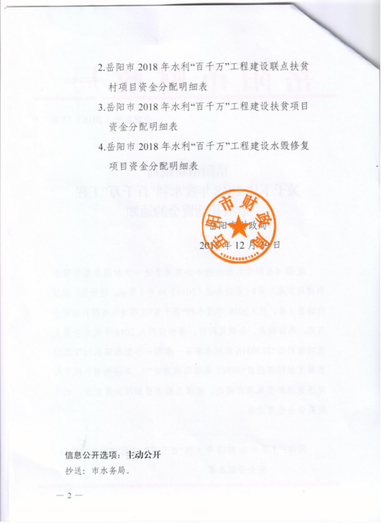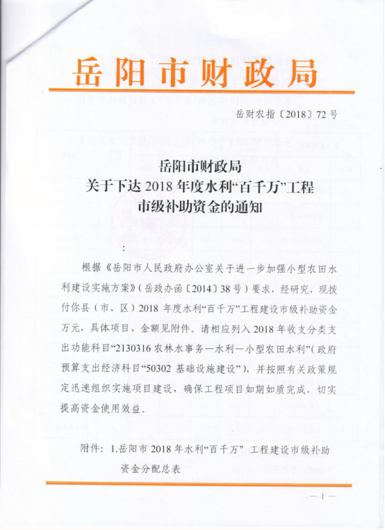 岳阳市财政局关于下达2018年度水利“百千万”工程市级补助资金的通知