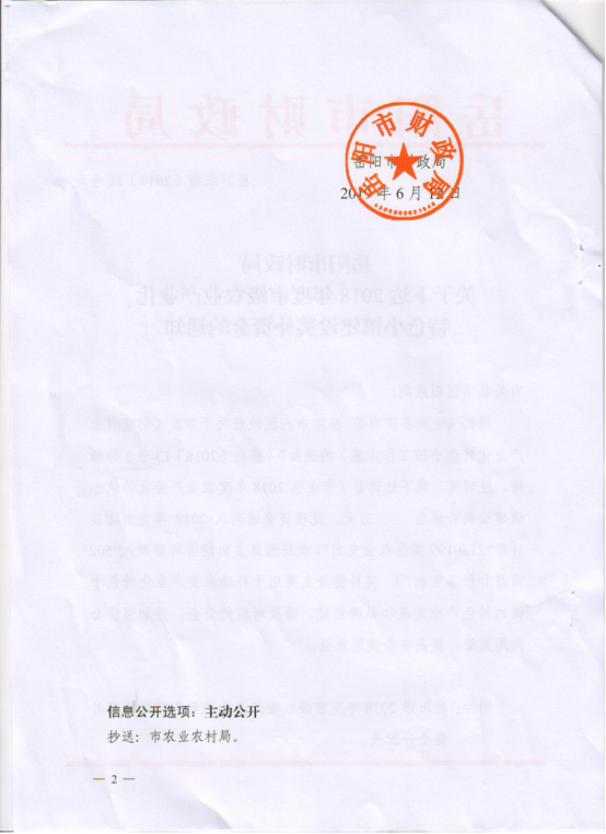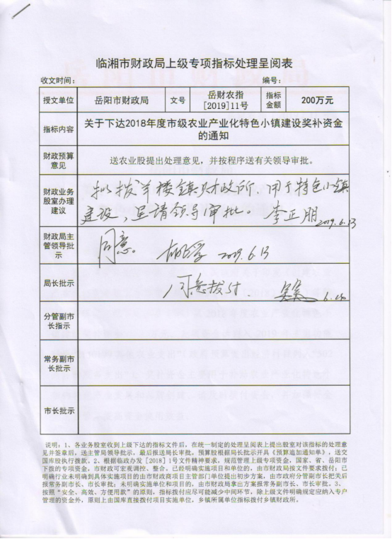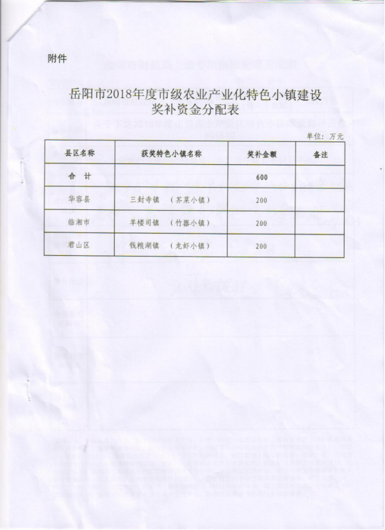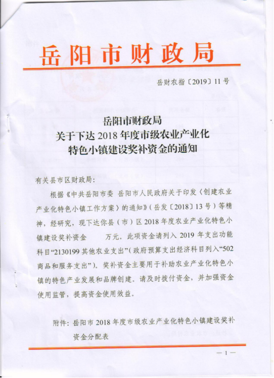 岳阳市财政局关于下达2018年度市级农业产业化特色小镇建设奖补资金的通知