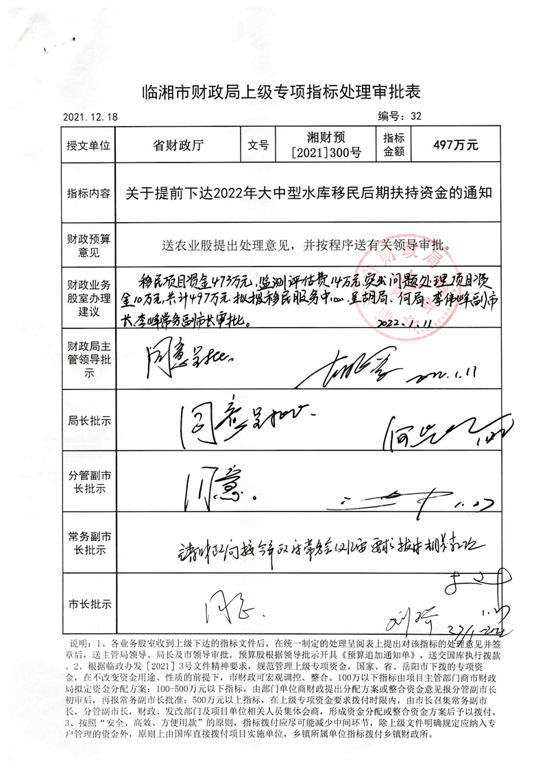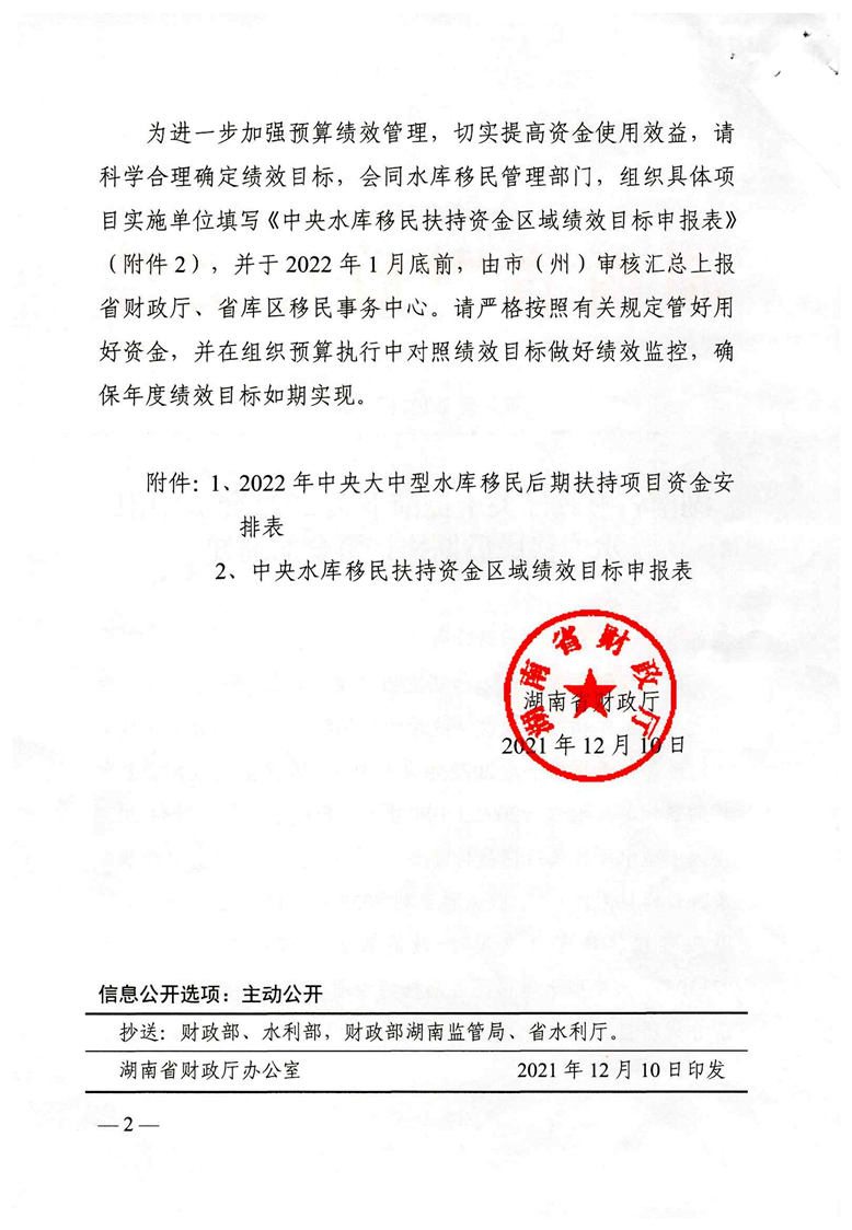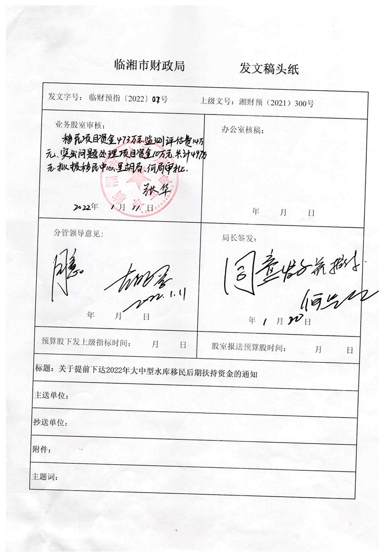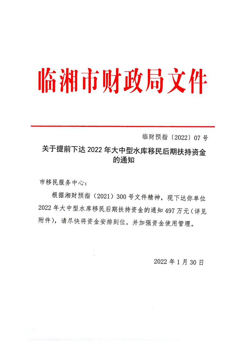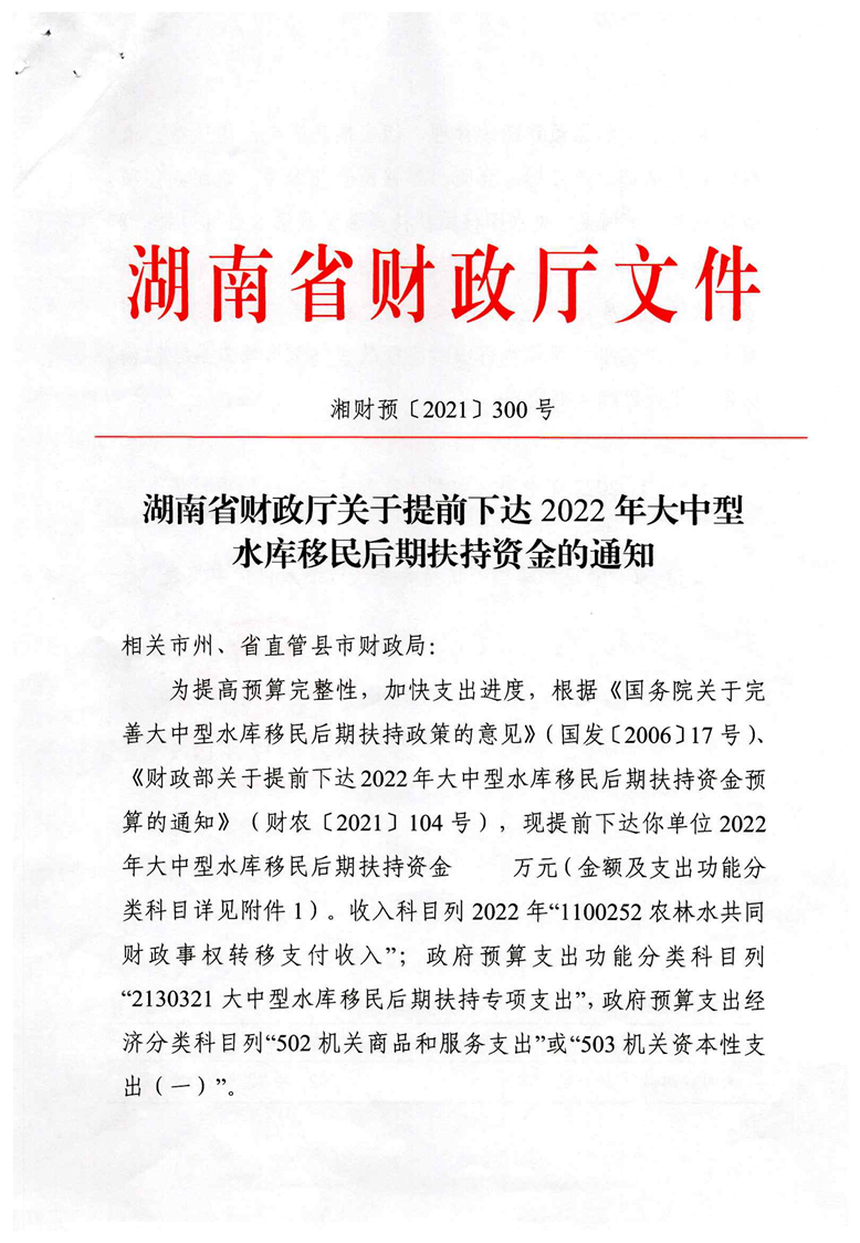关于提前下达2022年大中型水库移民后期扶持资金的通知
