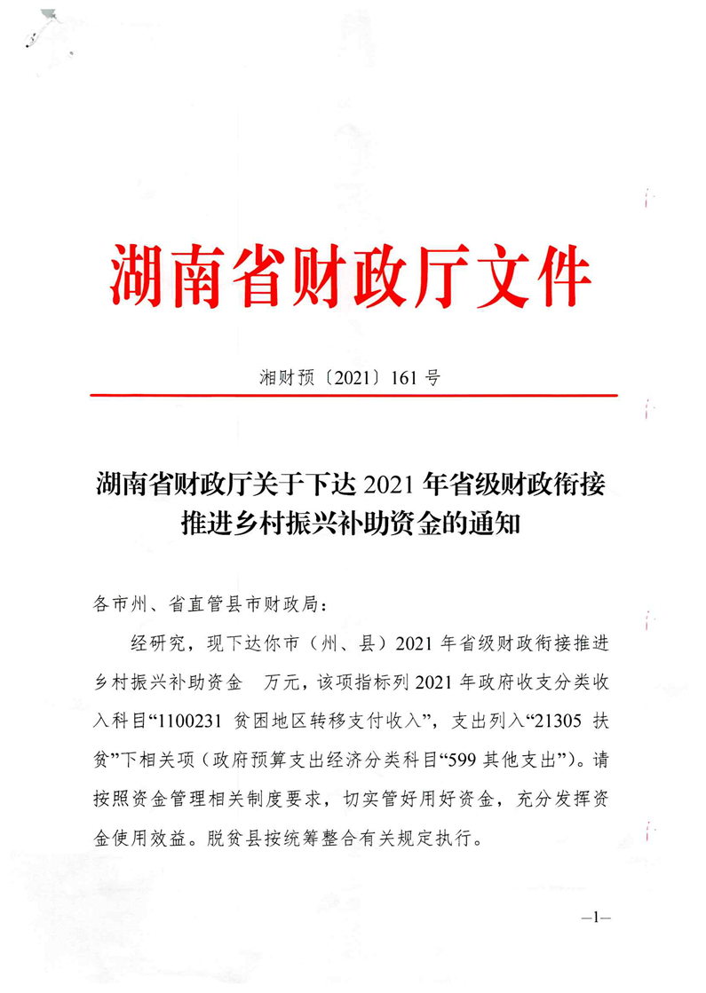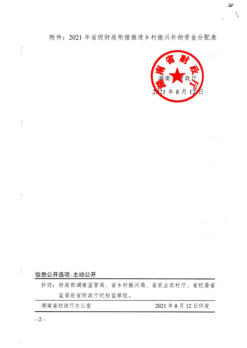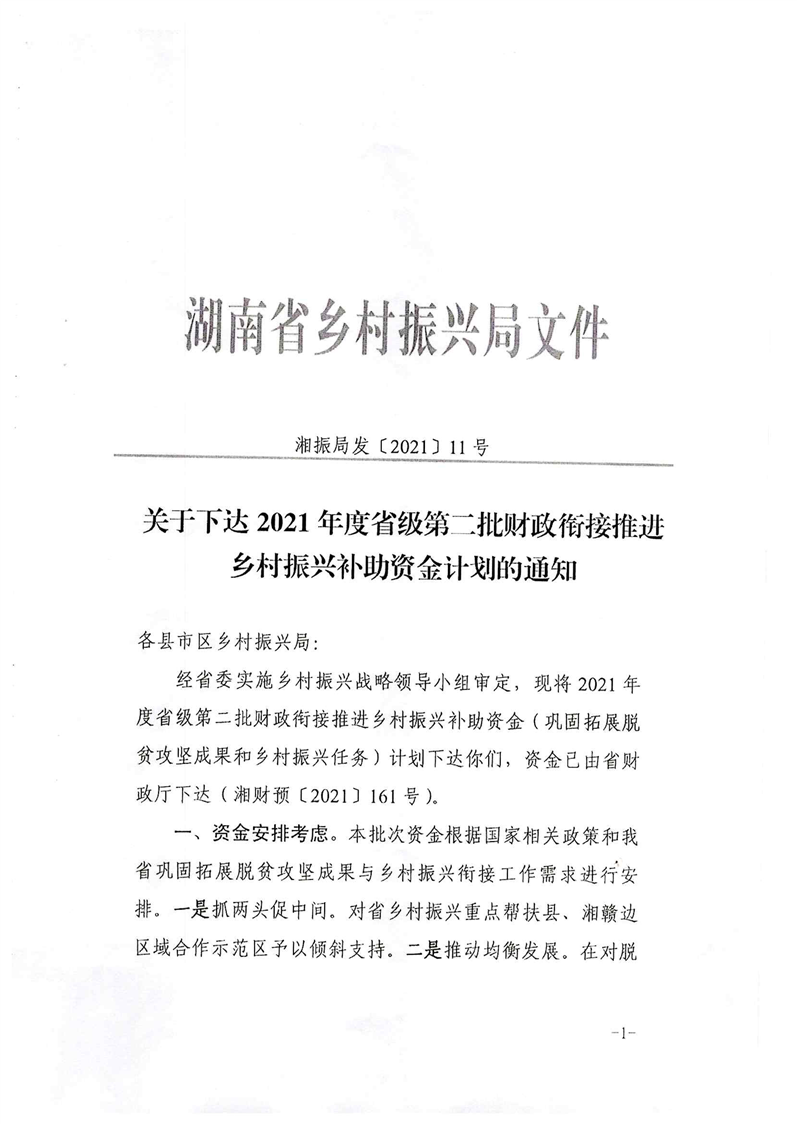 关于下达2021年省级财政衔接推进乡村振兴补助资金的通知