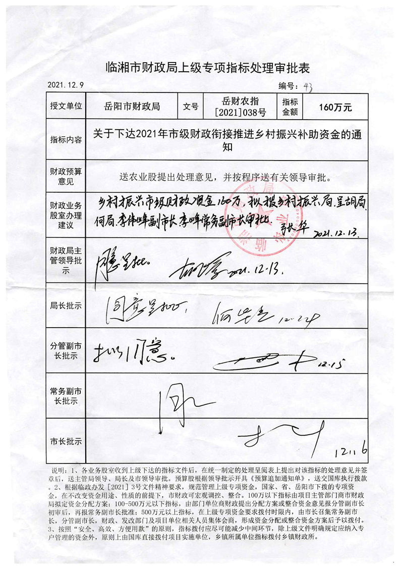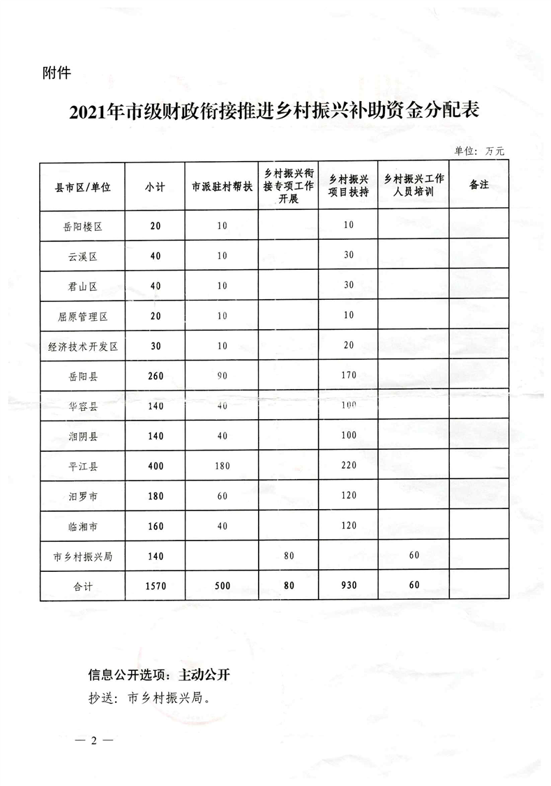岳阳市财政局关于下达2021年市级财政衔接推进乡村振兴补助资金的通知