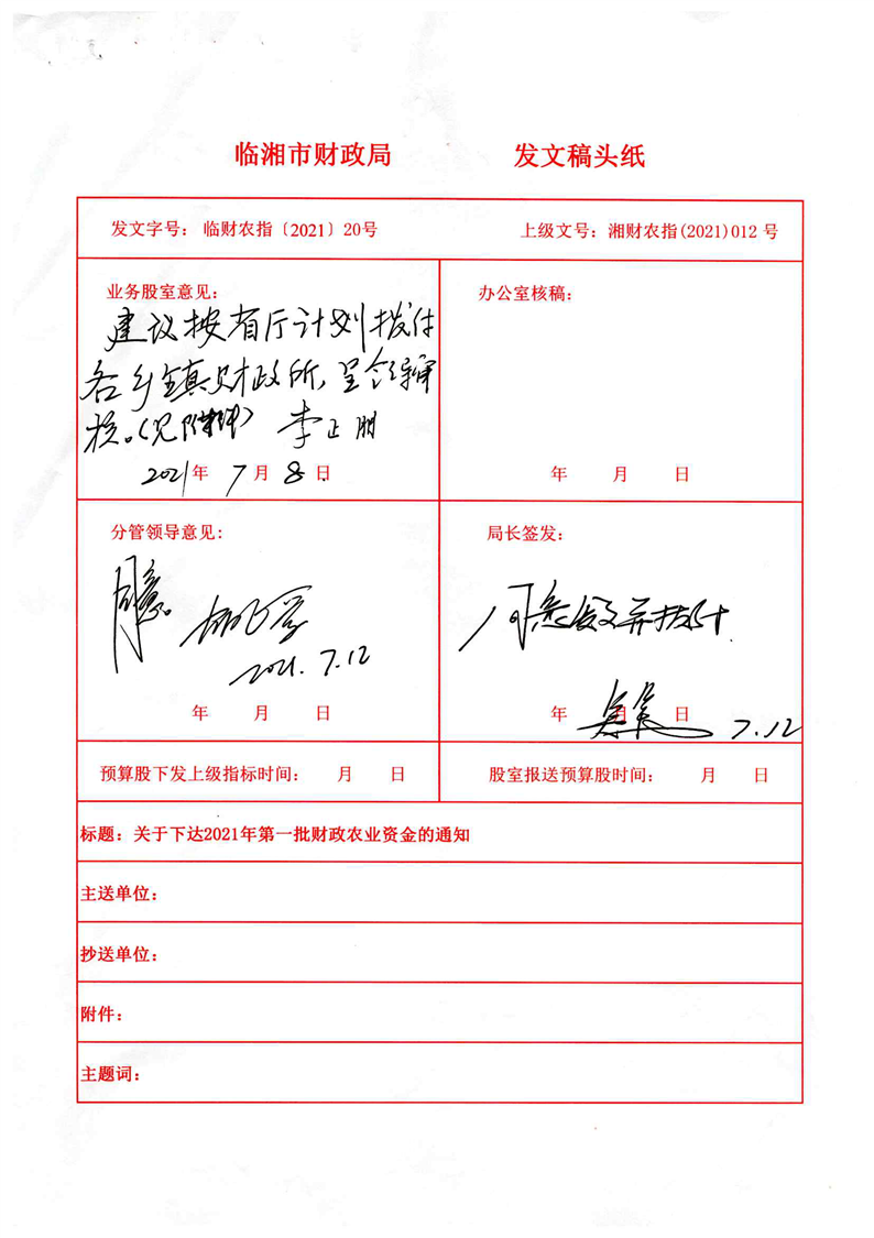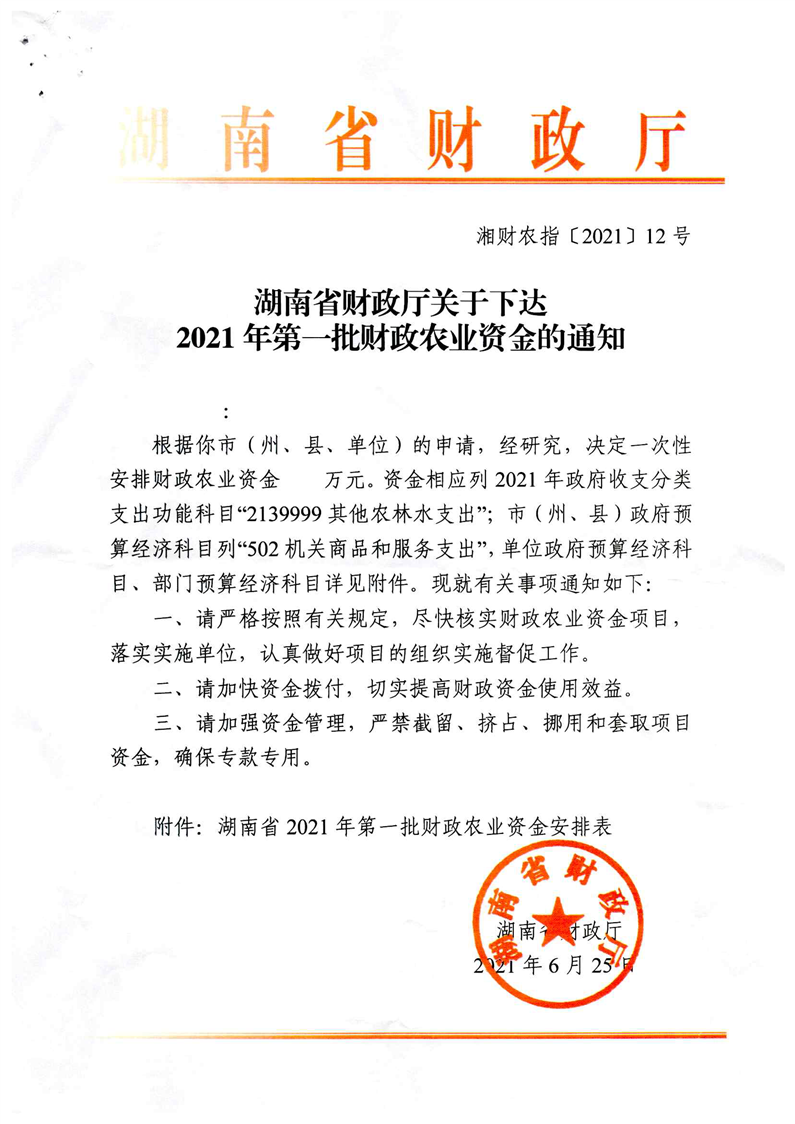 关于下达2021年第一批财政农业资金的通知