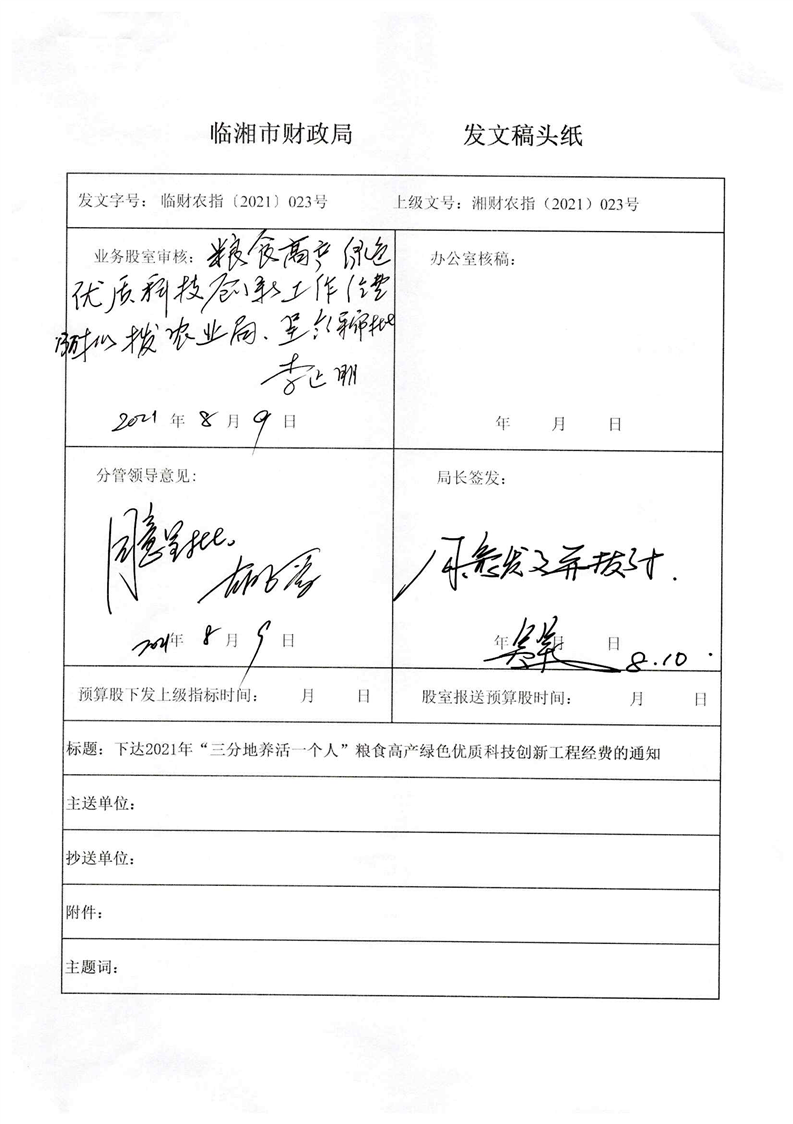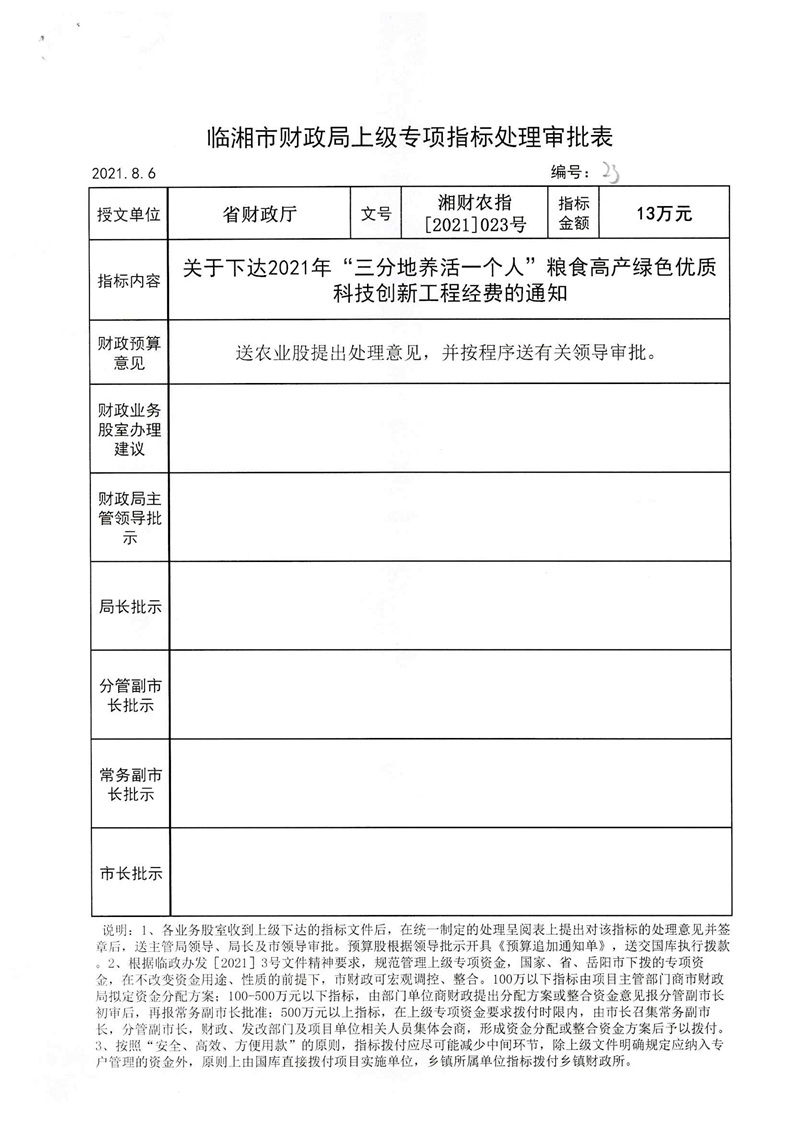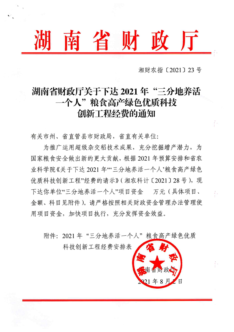 关于下达2021年“三分地养活一个人”粮食高产绿色优质科技创新工程经费的通知