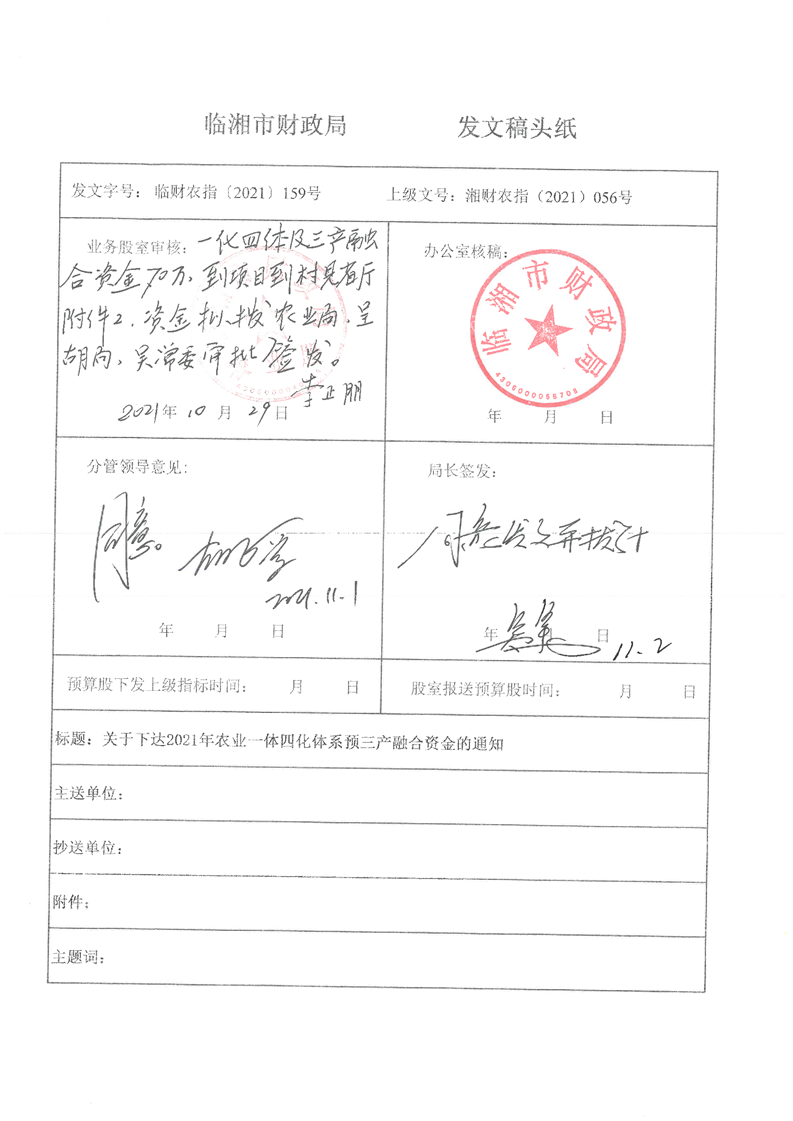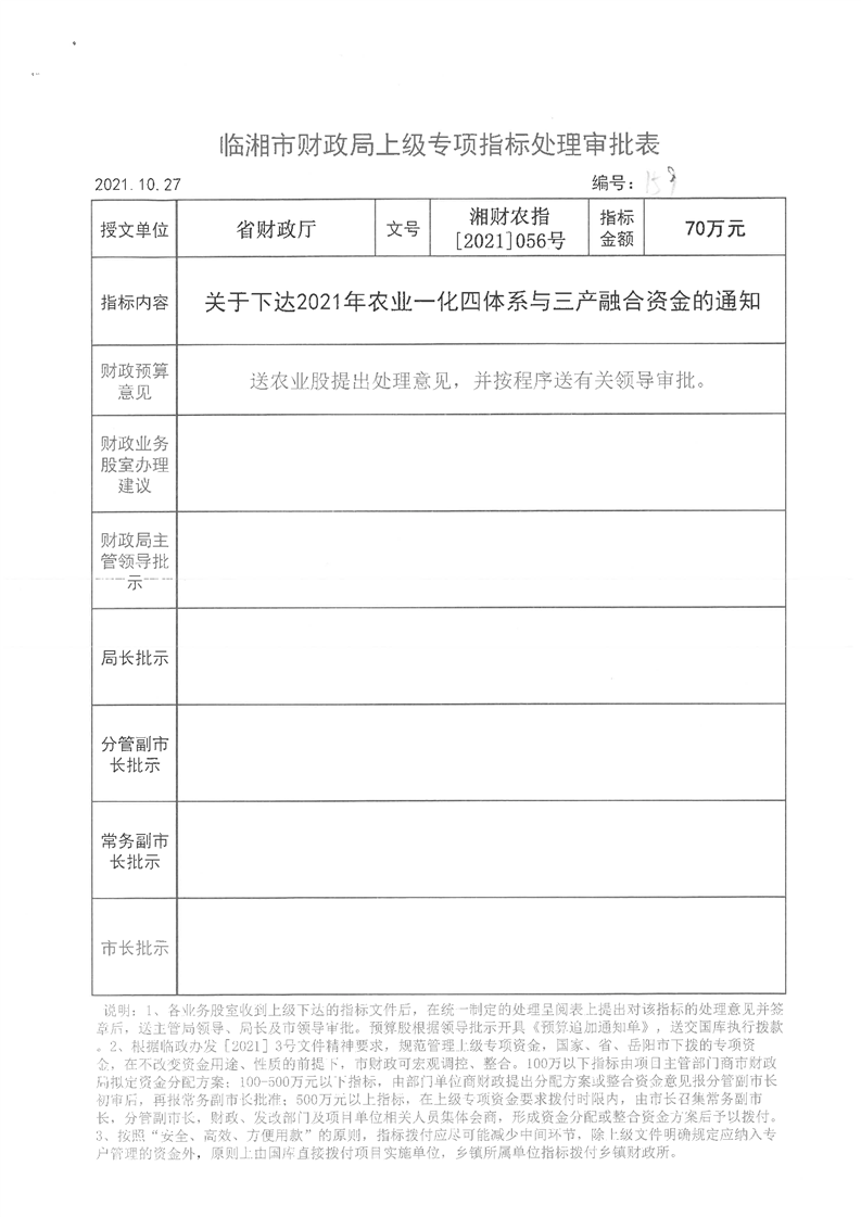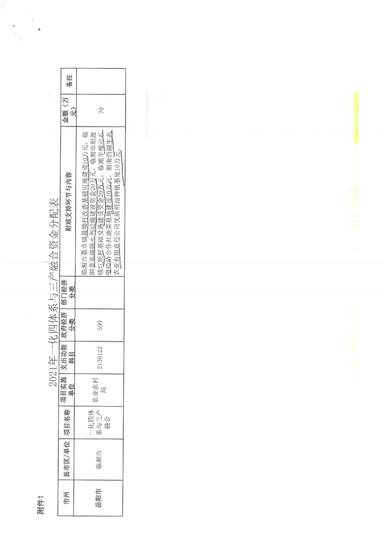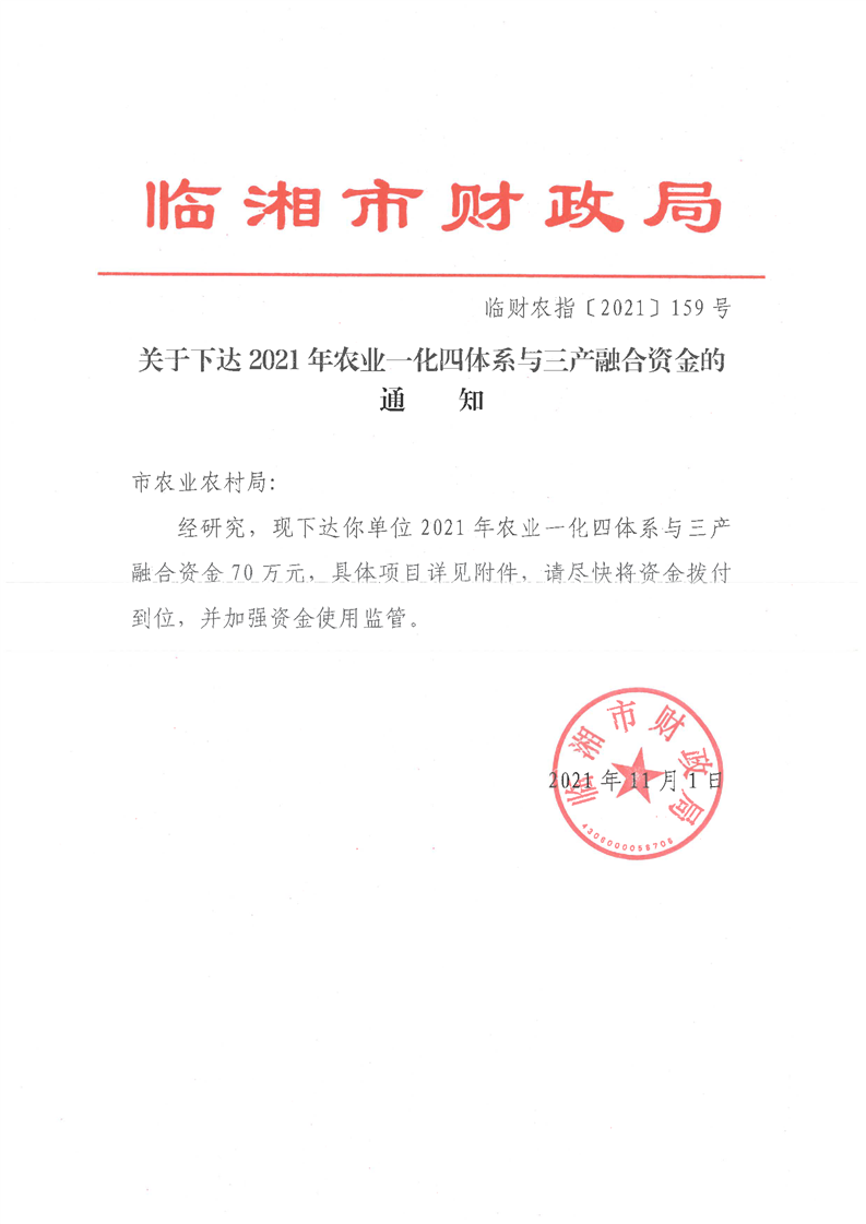 关于下达2021年农业一化四体系与三产融合资金的通知