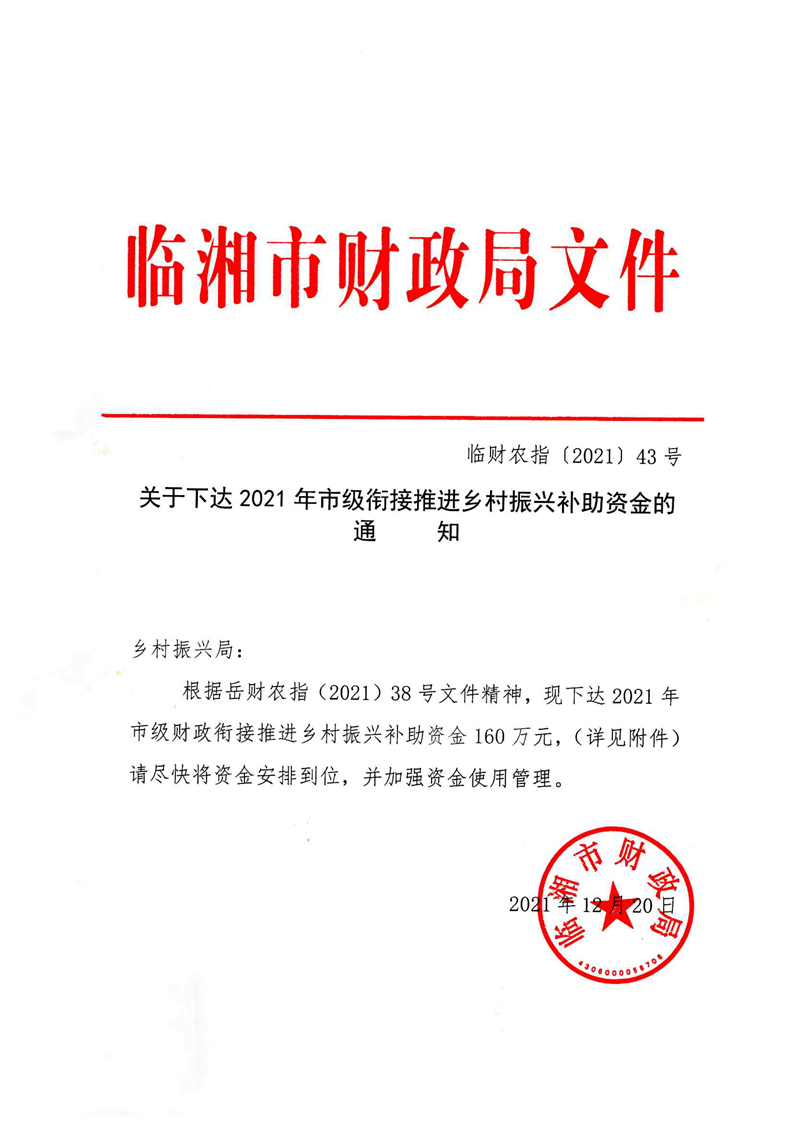 关于下达2021年市级财政衔接推进乡村振兴补助资金的通知