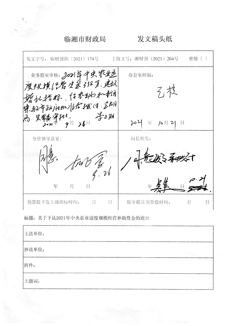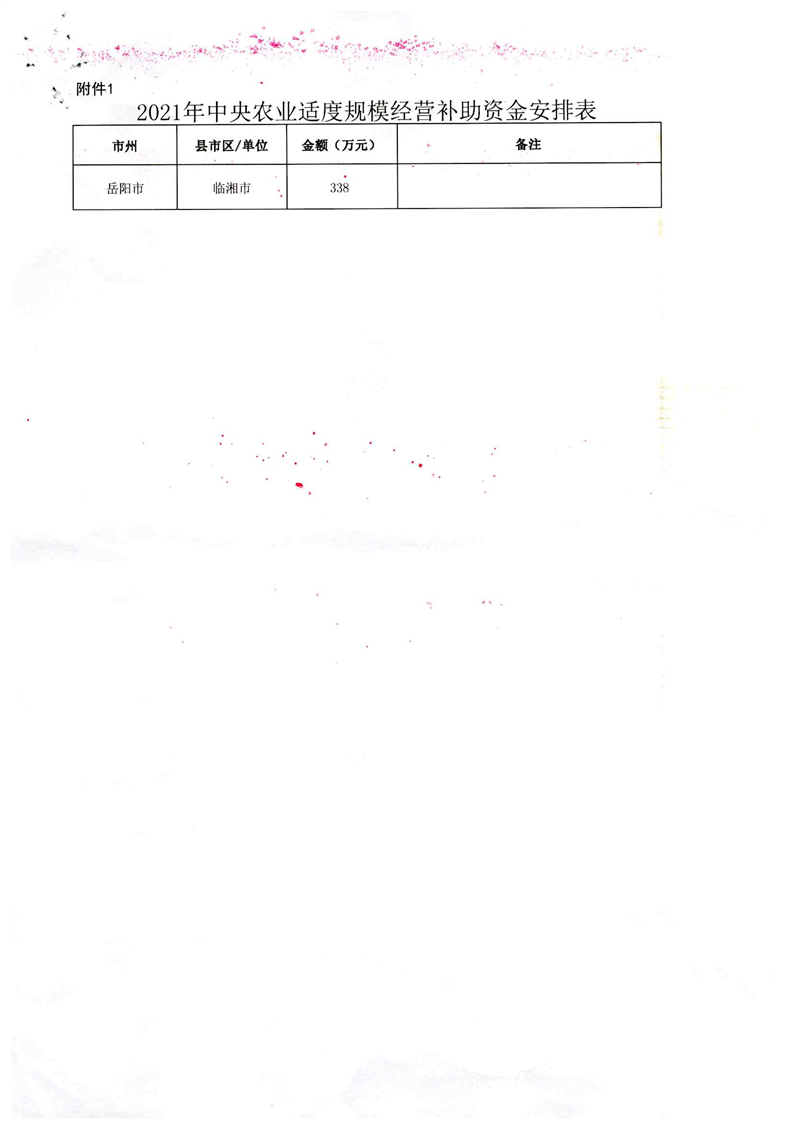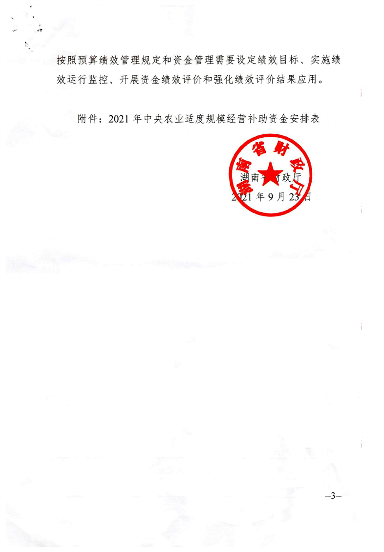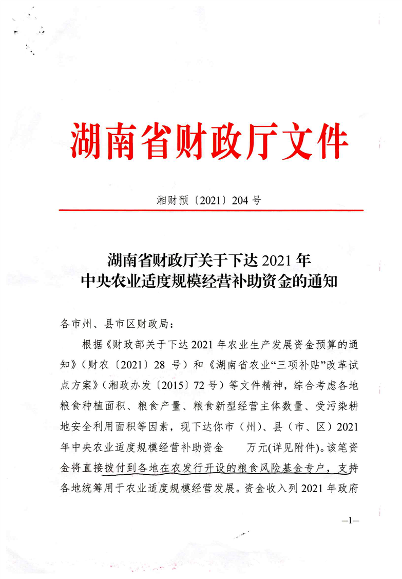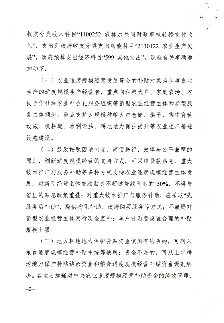 关于下达2021年中央农业适度规模经营补助资金的通知