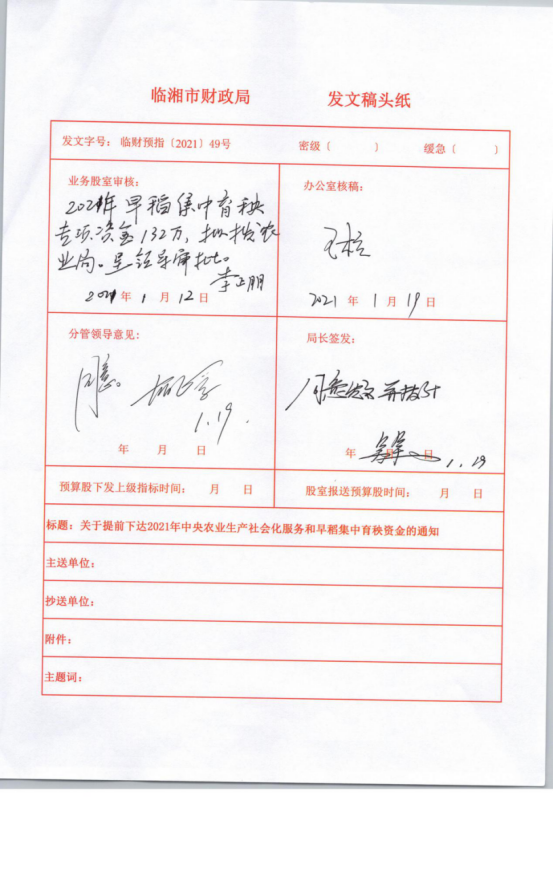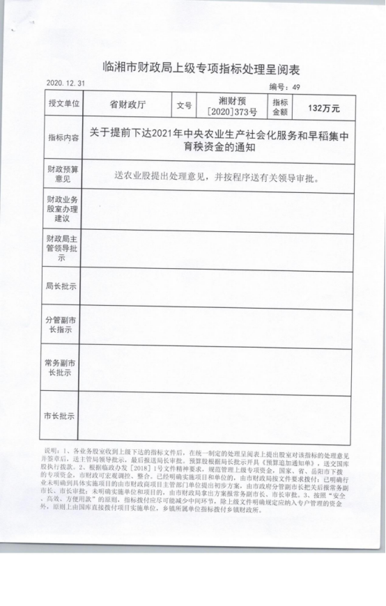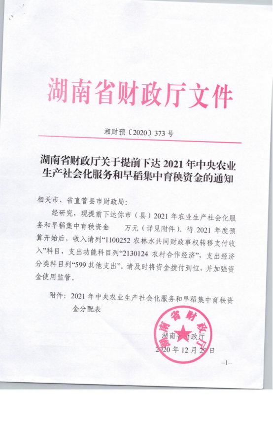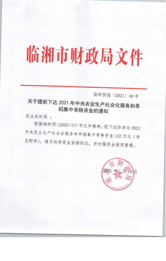 关于提前下达2021年中央农业生产社会化服务和早稻集中育秧资金的通知