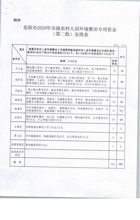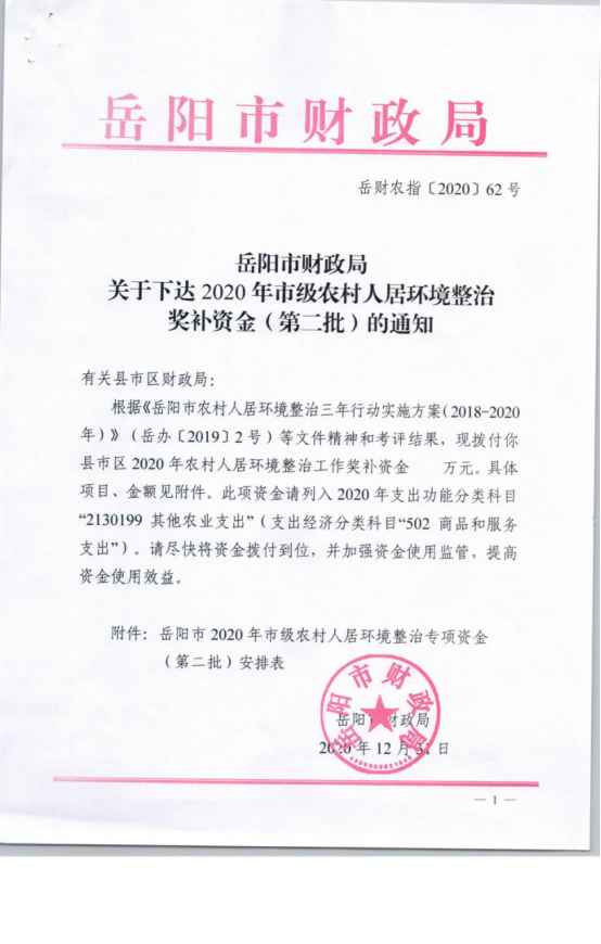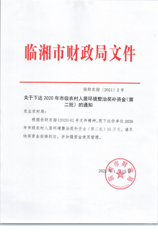 关于下达2020年市级农村人居环境整治奖补资金(第二批)的通知