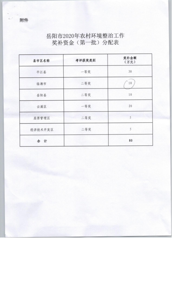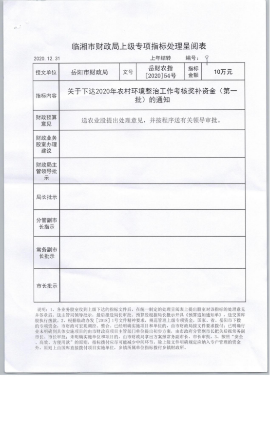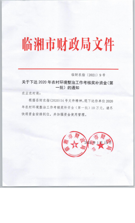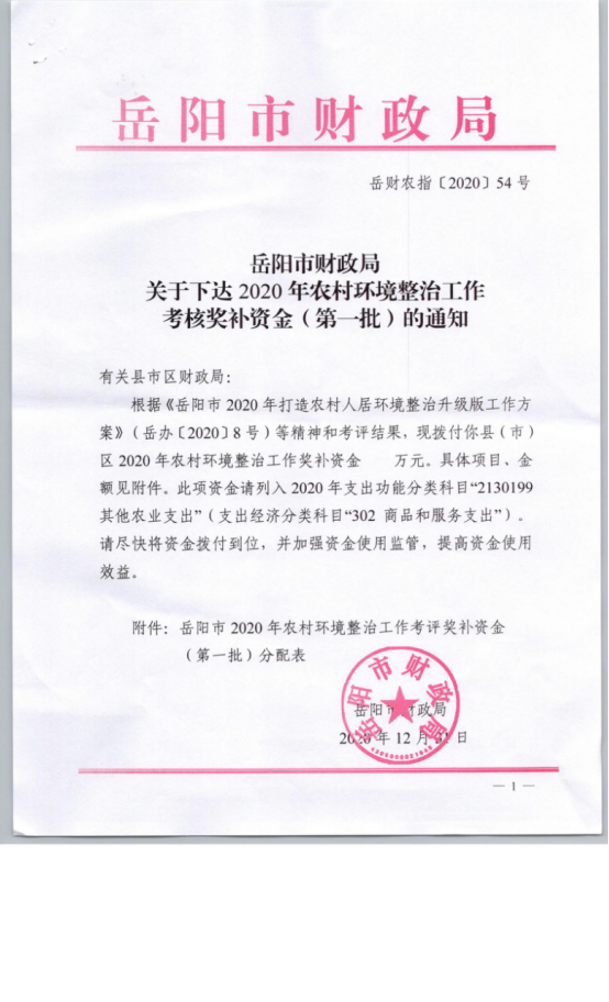 关于下达2020年农村环境整治工作考核奖补资金(第一批)的通知
