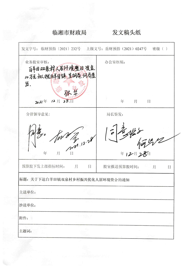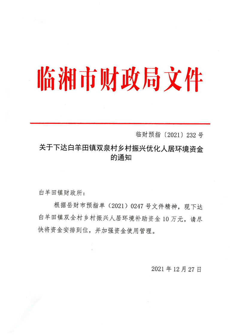 关于下达白羊田镇双泉村乡村振兴优化人居环境资金的通知
