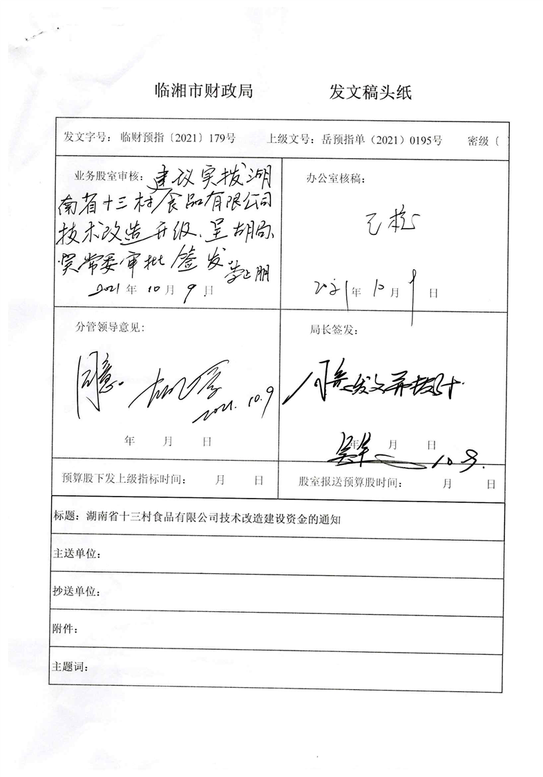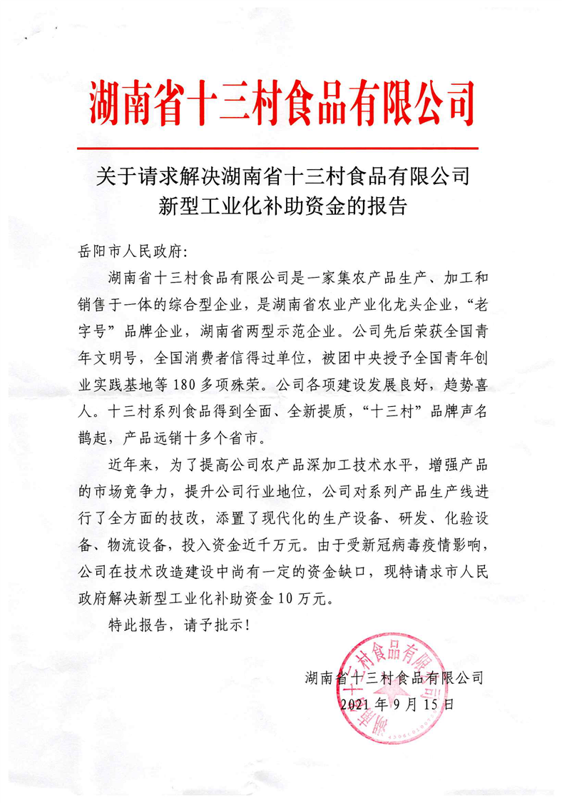 关于请求解决湖南省十三村食品有限公司新型工业化补助资金的报告