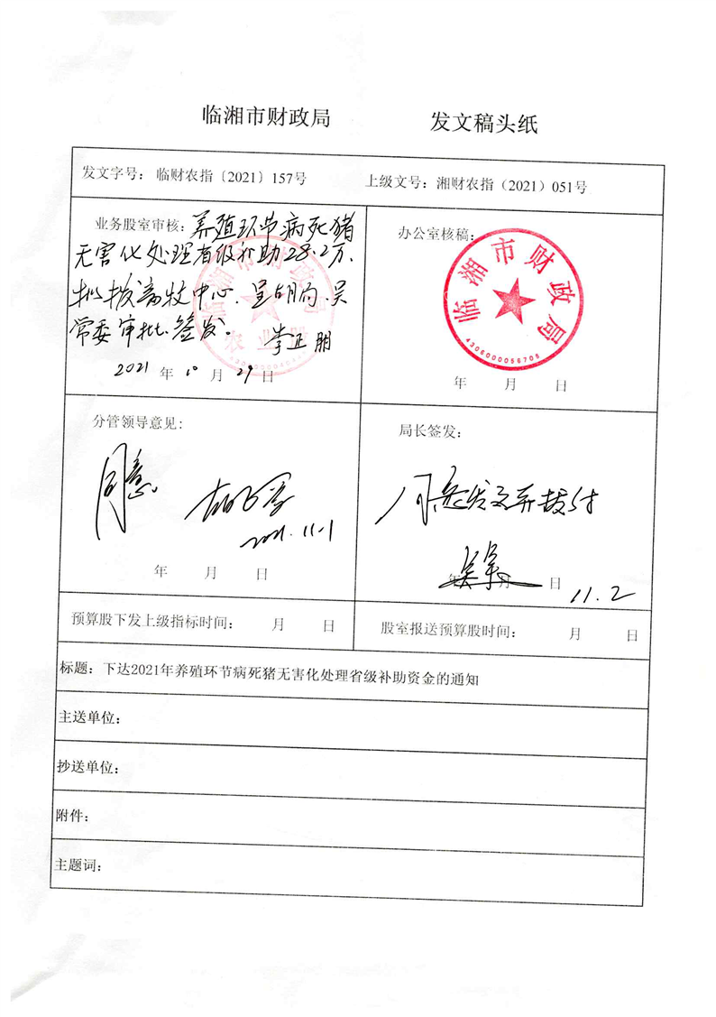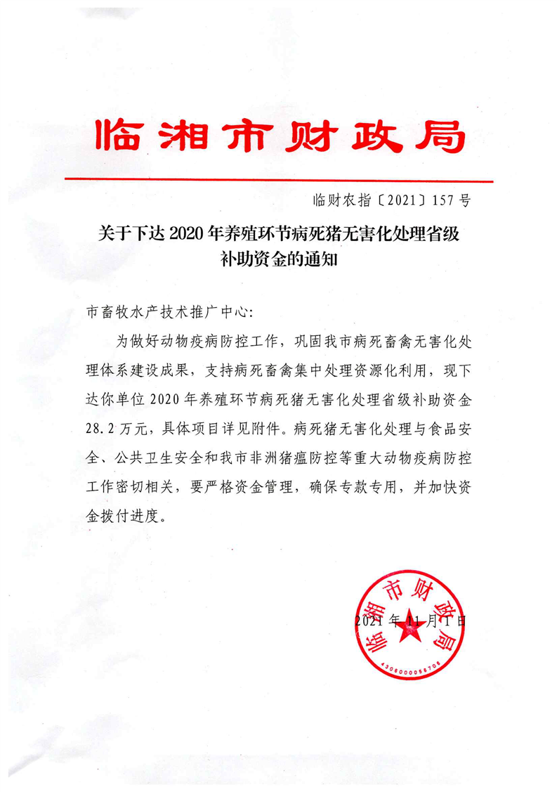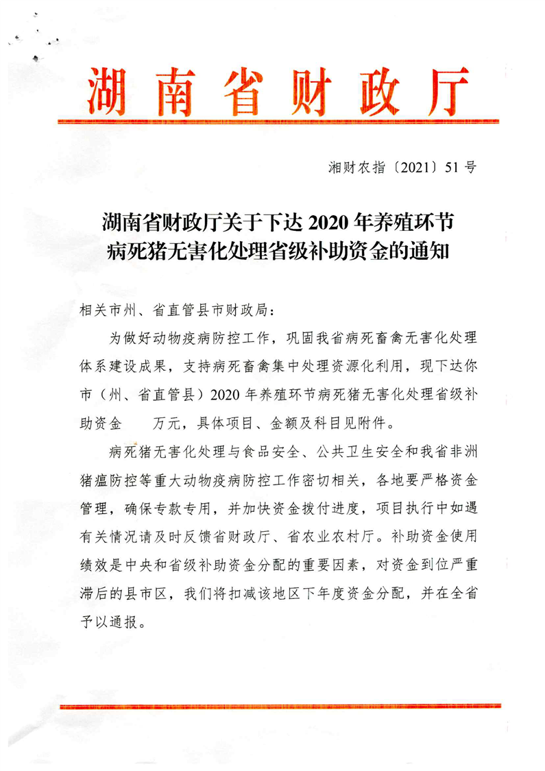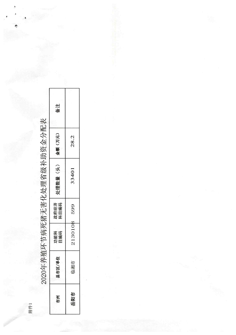 关于下达2020年养殖环节病死猪无害化处理省级补助资金的通知
