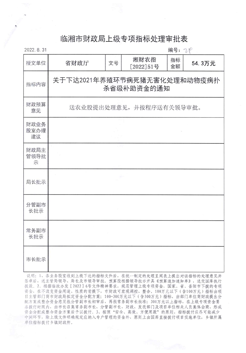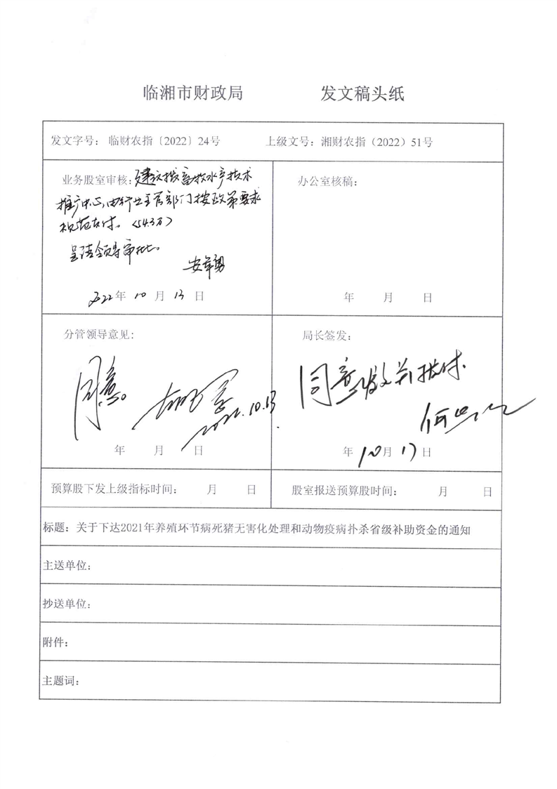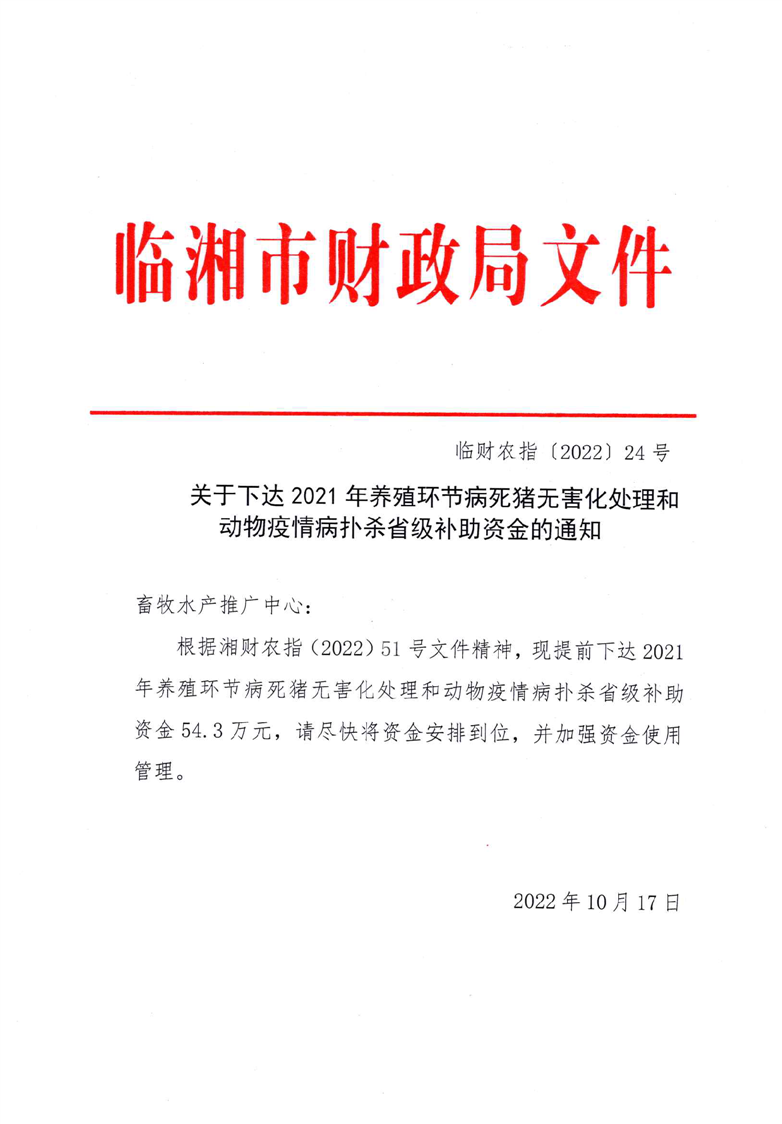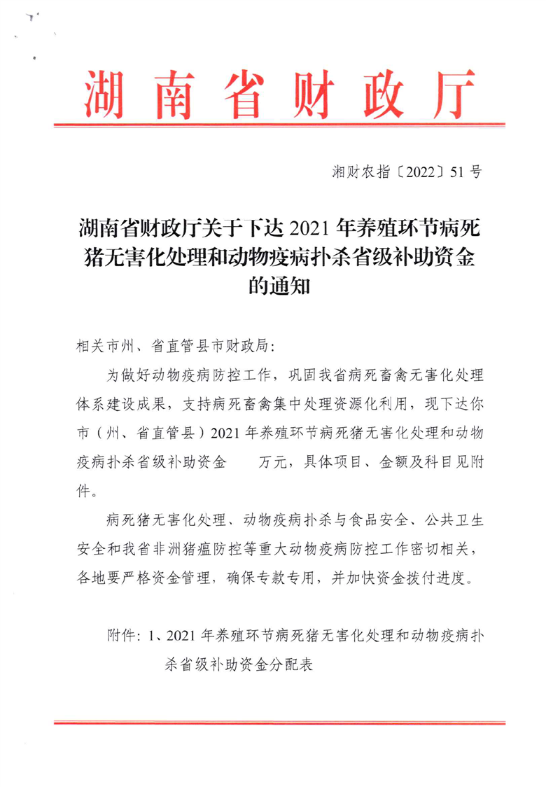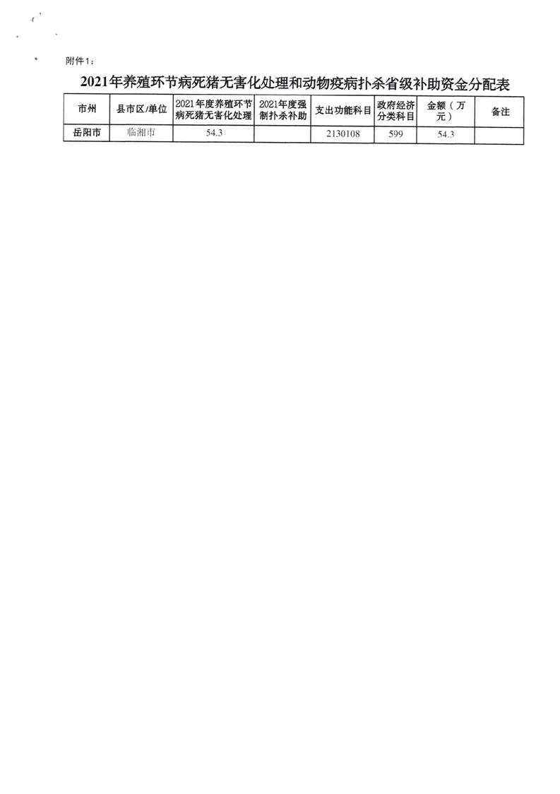 关于下达2021年养殖环节病死猪无害化处理和动物疫情病扑杀省级补助资金的通知