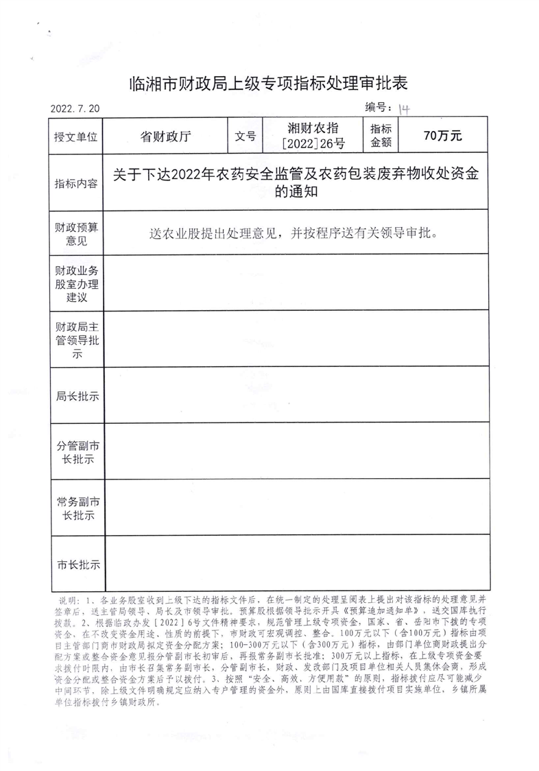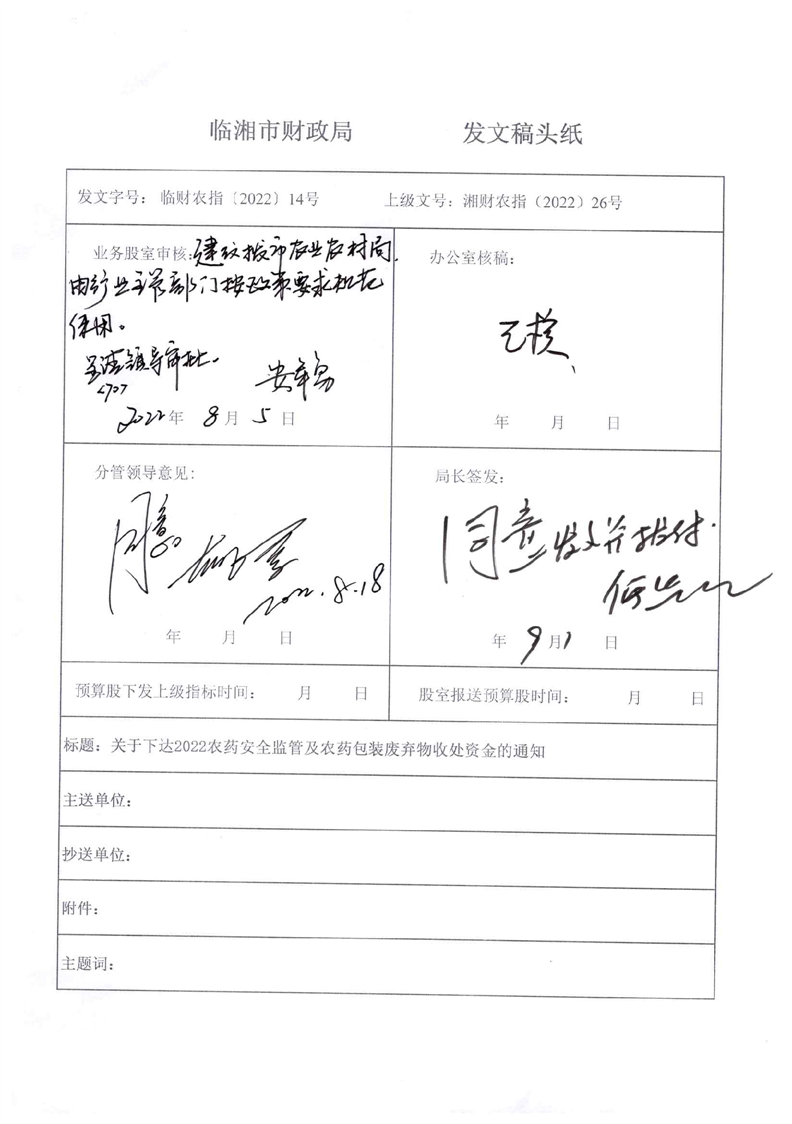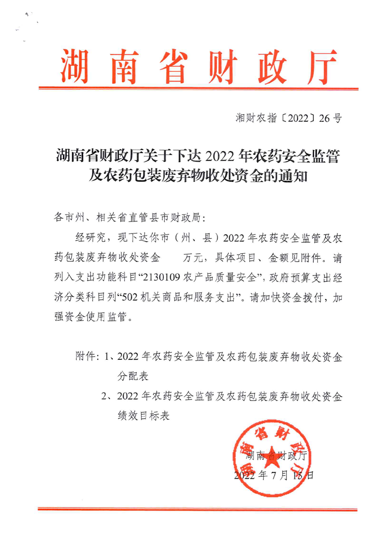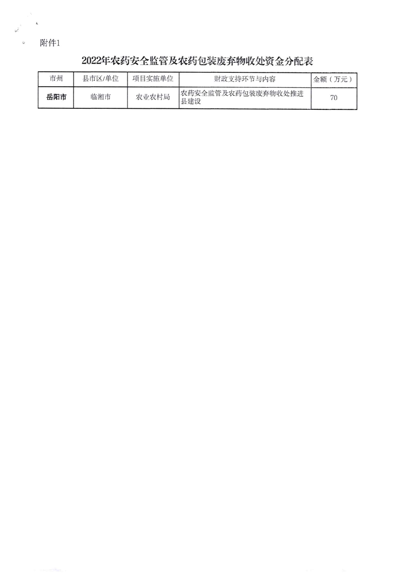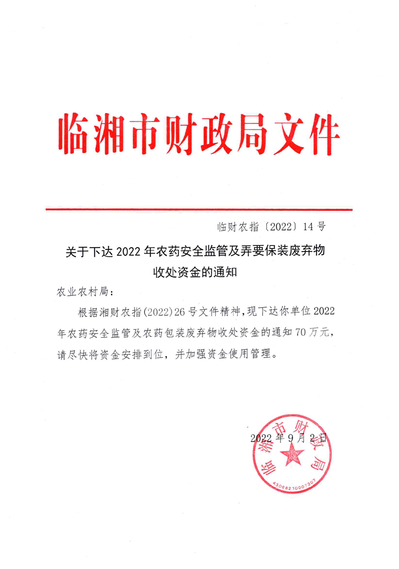 关于下达2022年农药安全监管及农药保装废弃物收处资金的通知