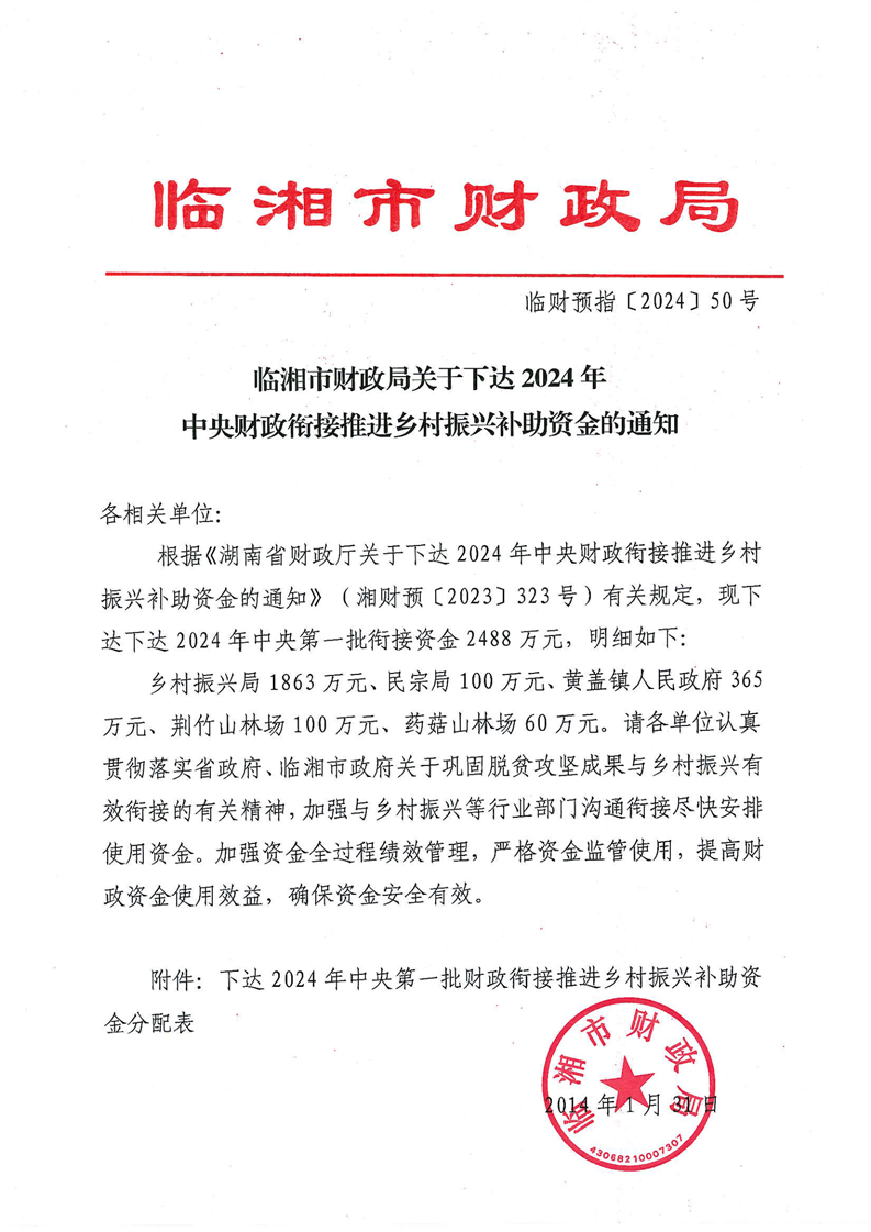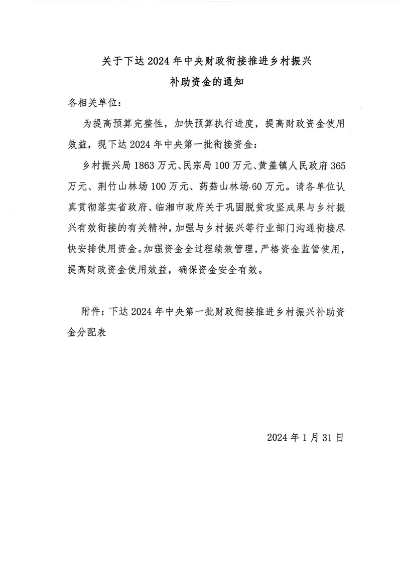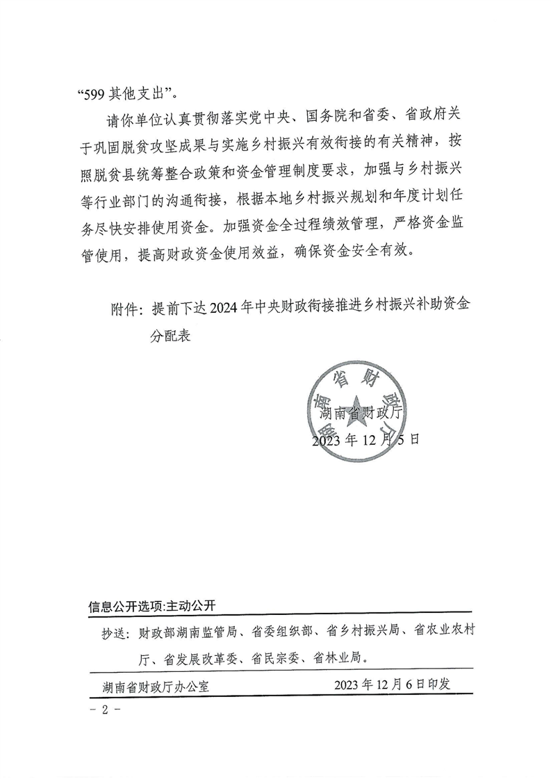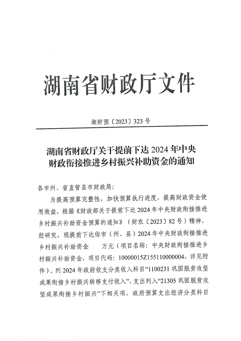 湖南省财政厅关于提现下达2024年中央财政衔接推进乡村振兴补助资金的通知(湘财预〔2023〕323号)