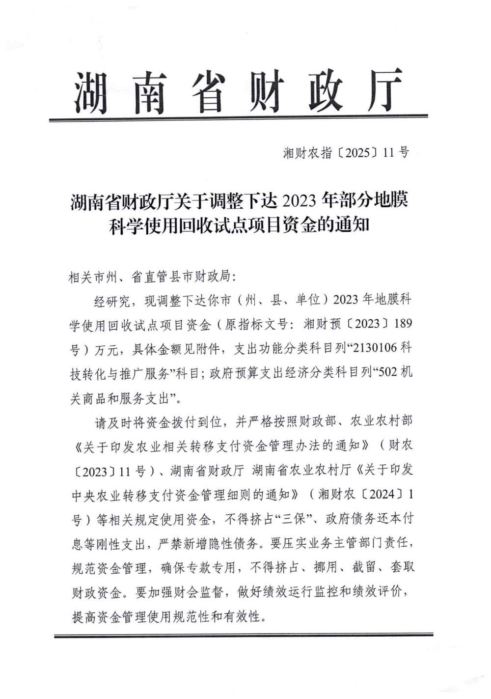 湖南省财政厅关于调整下达2023年部分地膜科学使用回收试点项目资金的通知