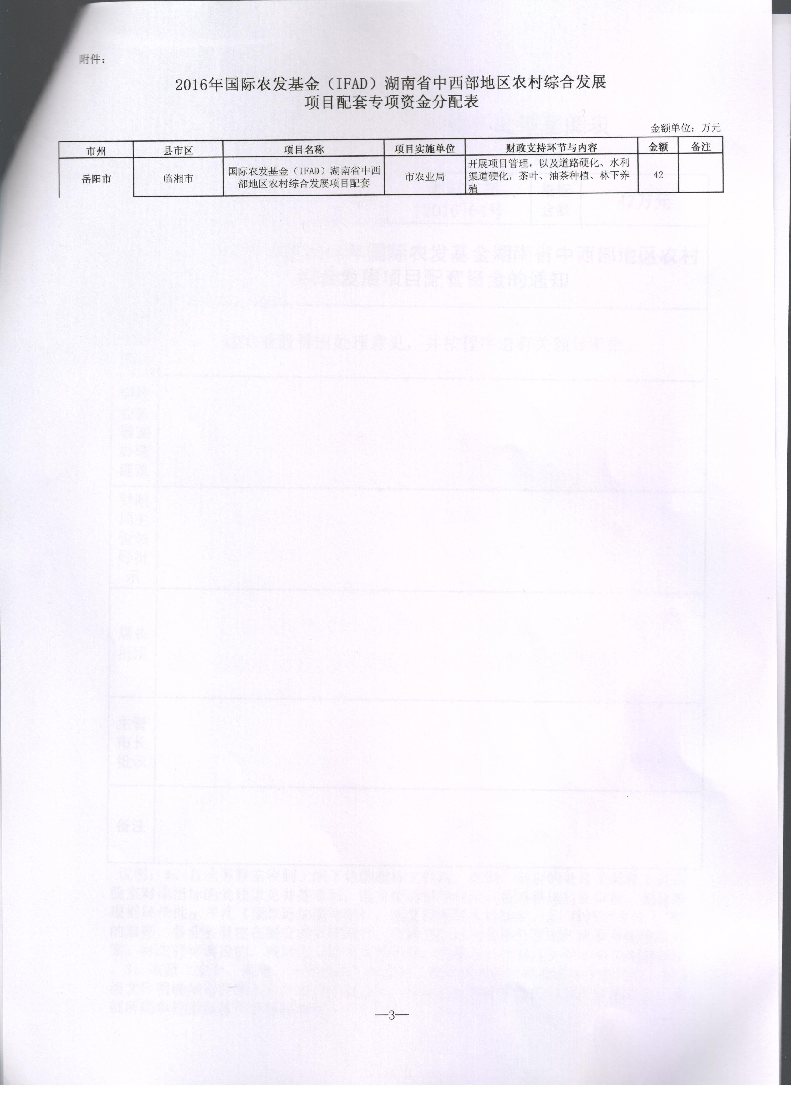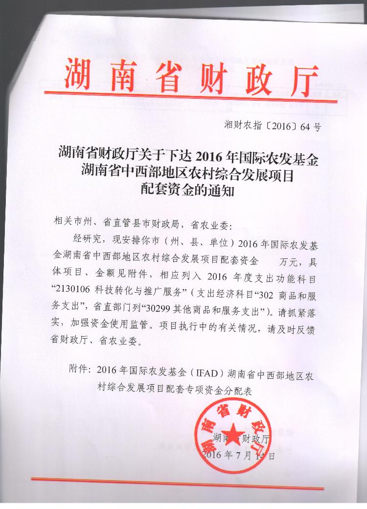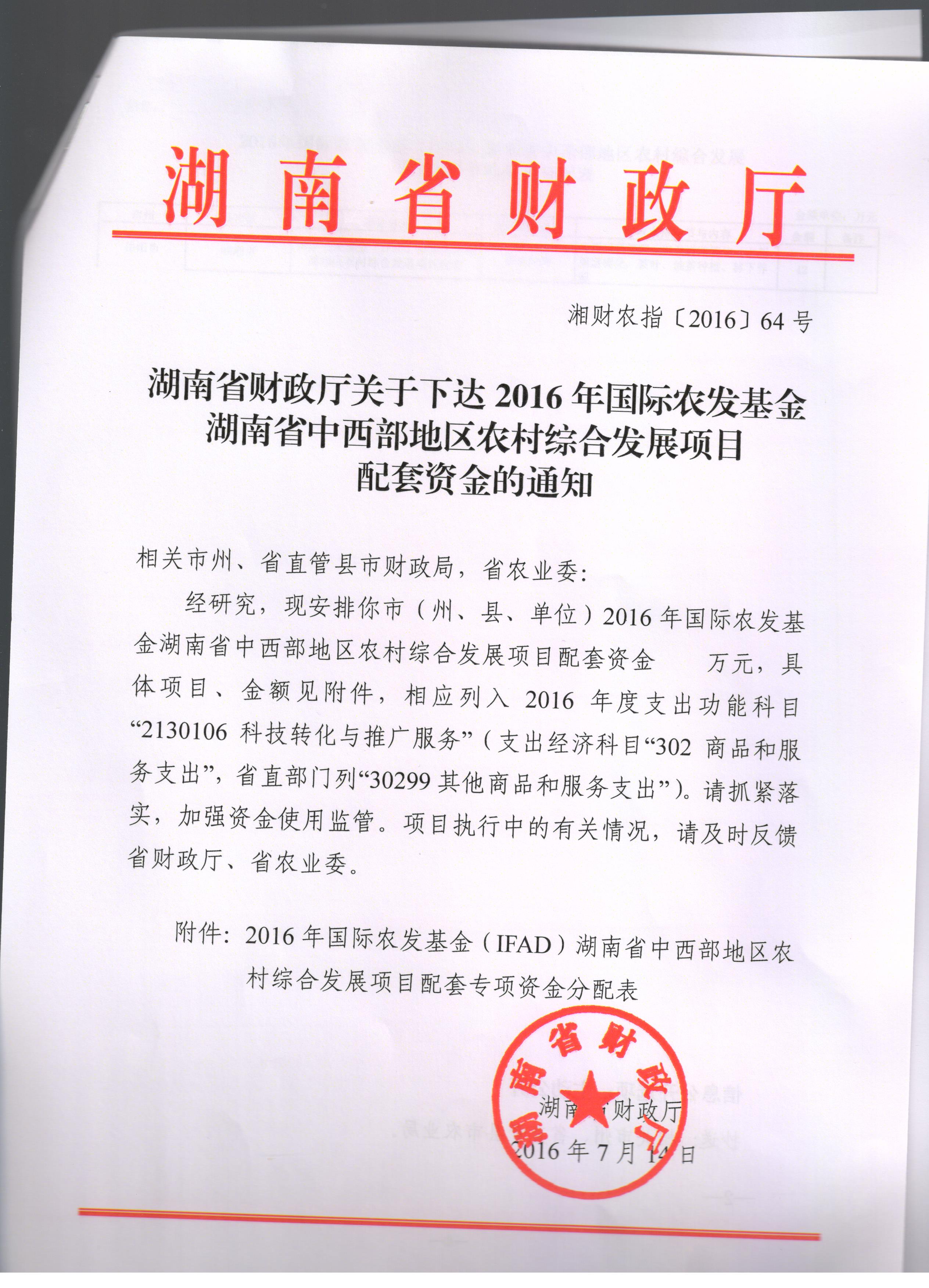 关于下达2016年国际农发基金湖南省中西部地区农村综合发展项目配套资金的通知