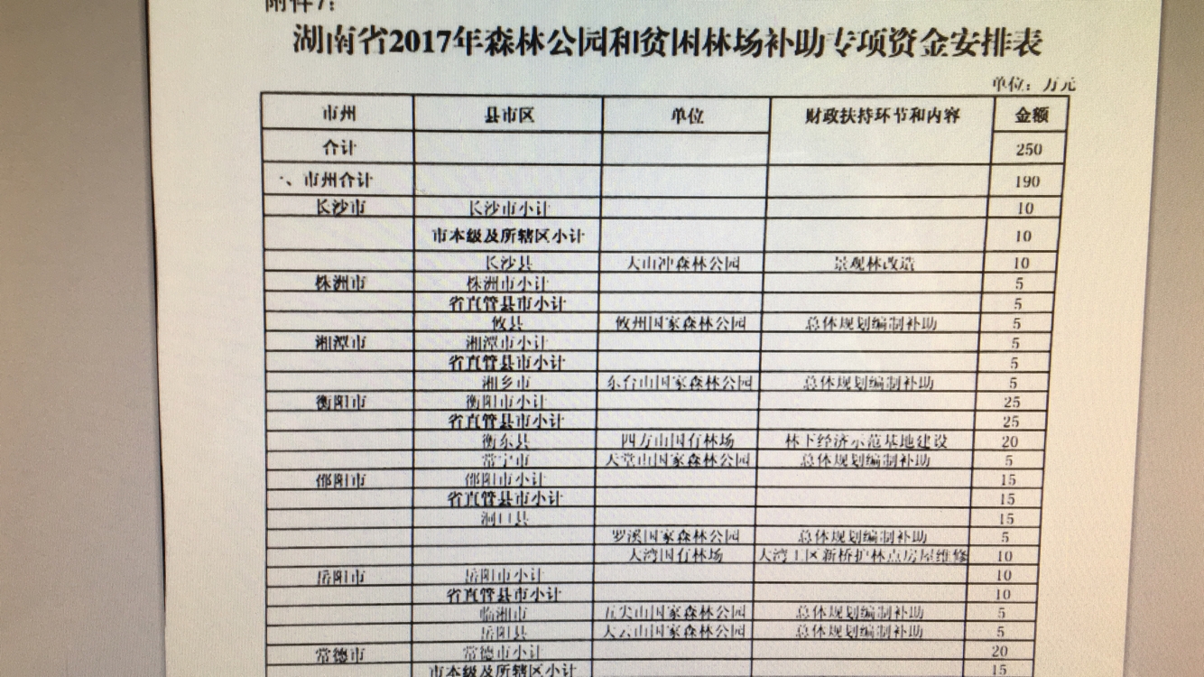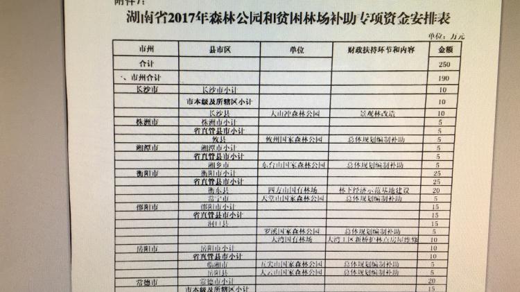 湖南省2017年森林公园和贫困林场补助专项资金安排表