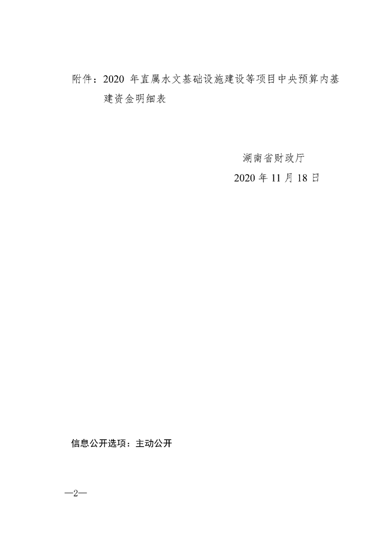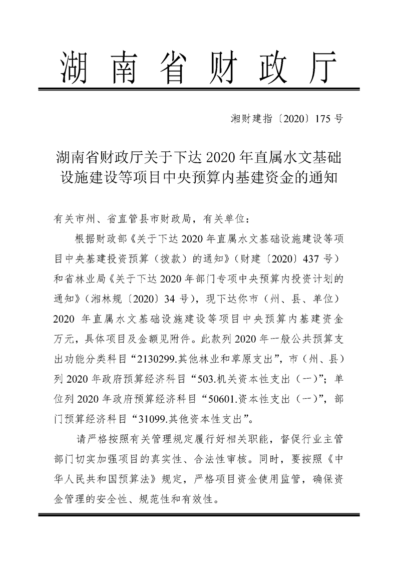 湖南省财政厅关于下达2020年直属水文基础设施建设等项目中央预算内基建资金的通知