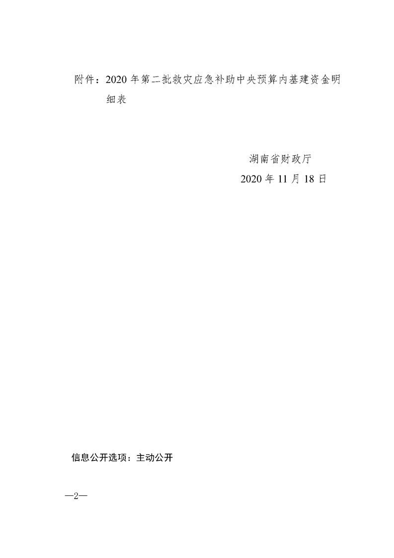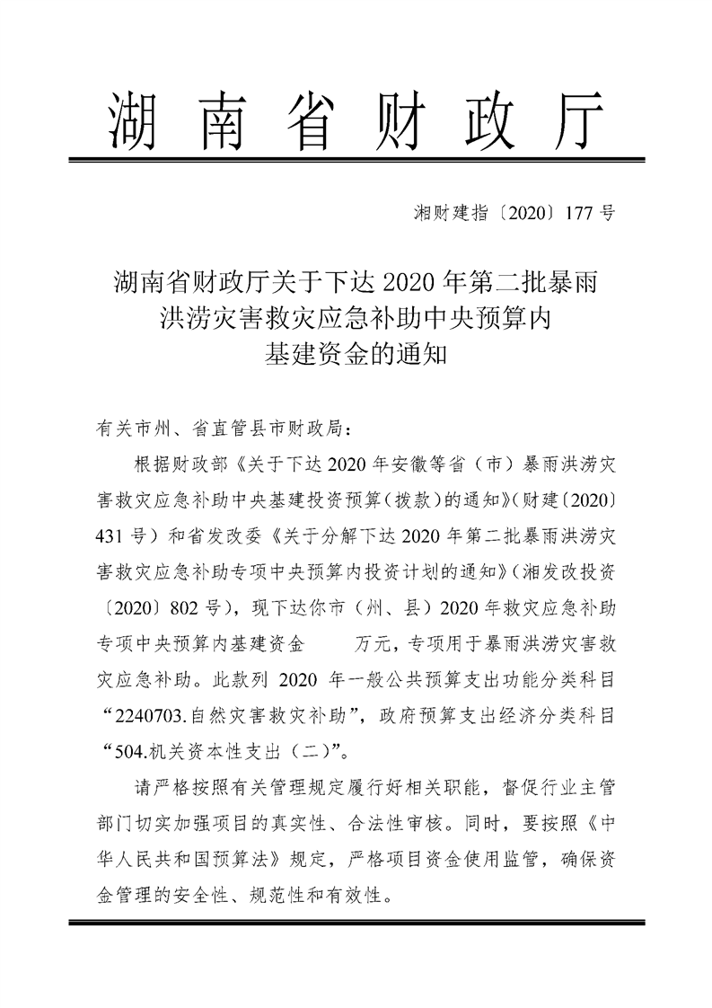 湖南省财政厅关于下达2020年第二批暴雨洪涝灾害救灾应急补助中央预算内基建资金的通知