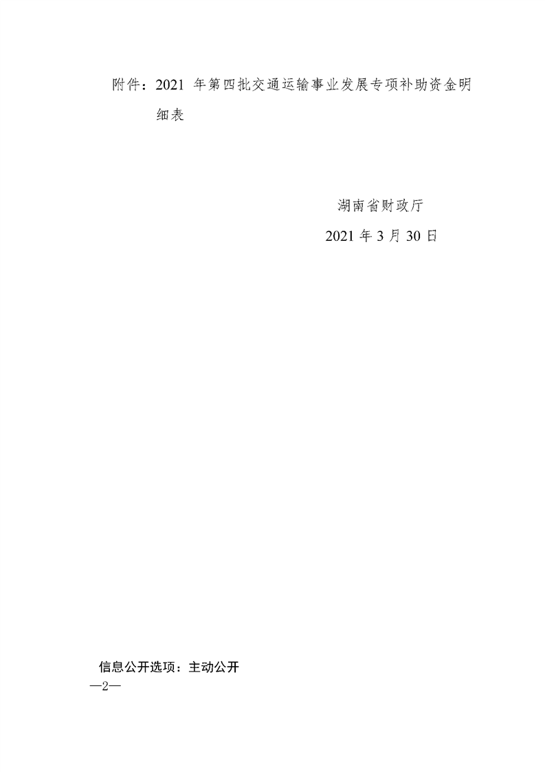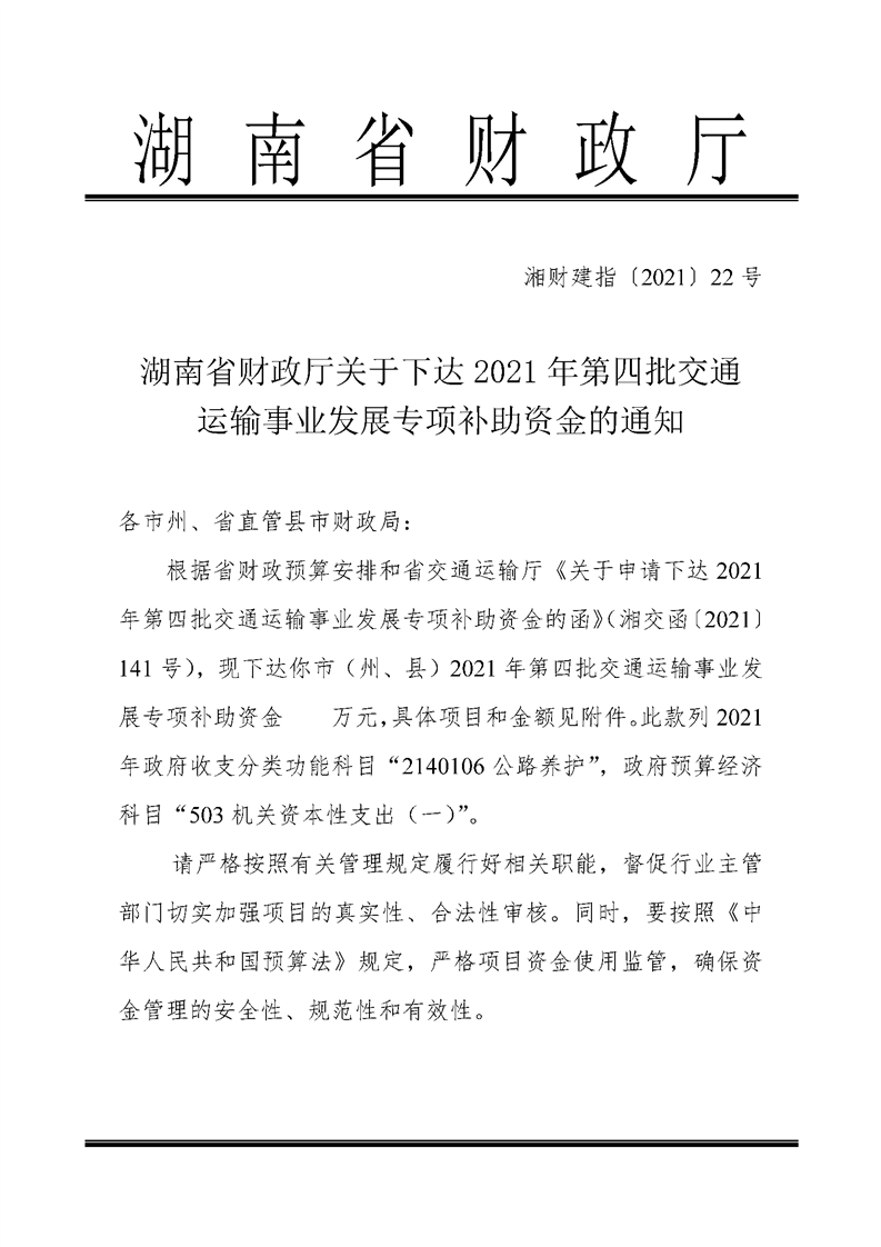 湖南省财政厅关于下达2021年第四批交通运输事业发展专项补助资金的通知