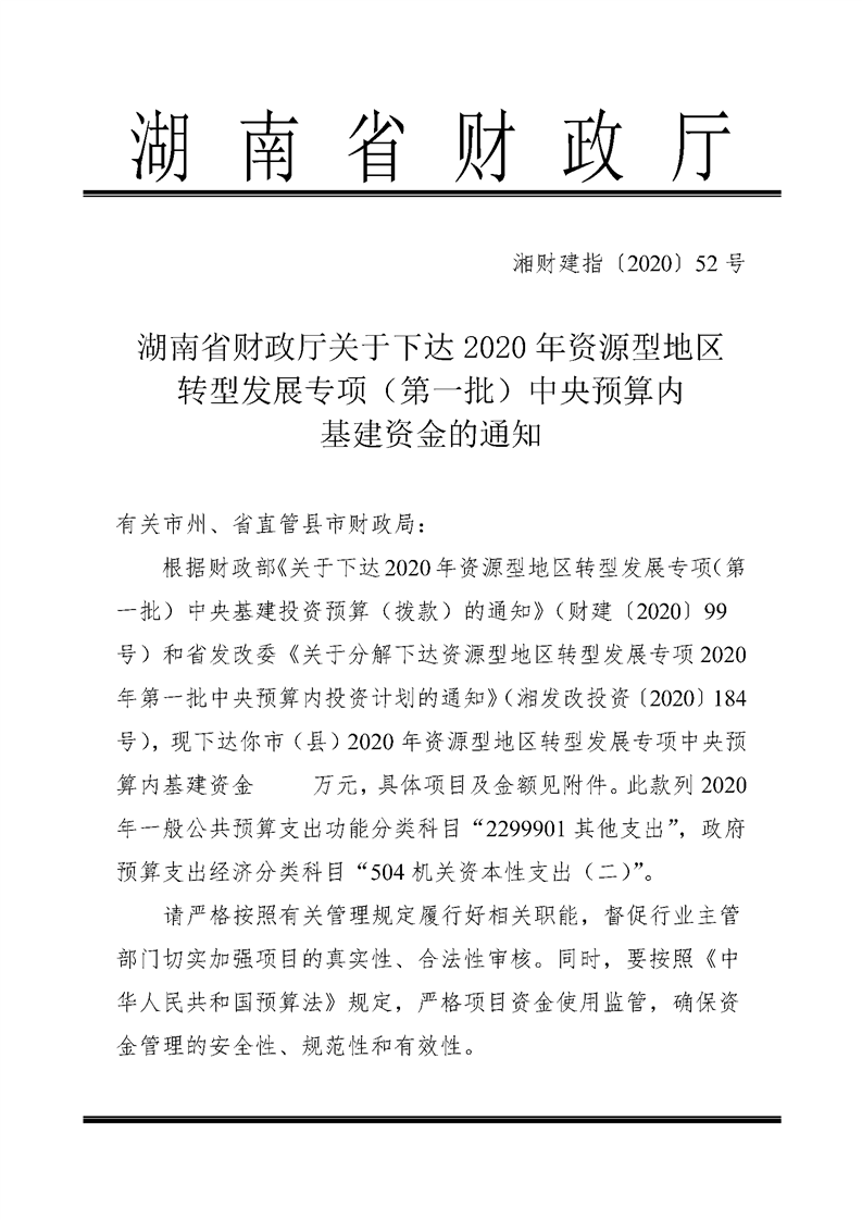 湖南省财政厅关于下达2020年资源型地区转型发展专项(第一批)中央预算内基建资金的通知