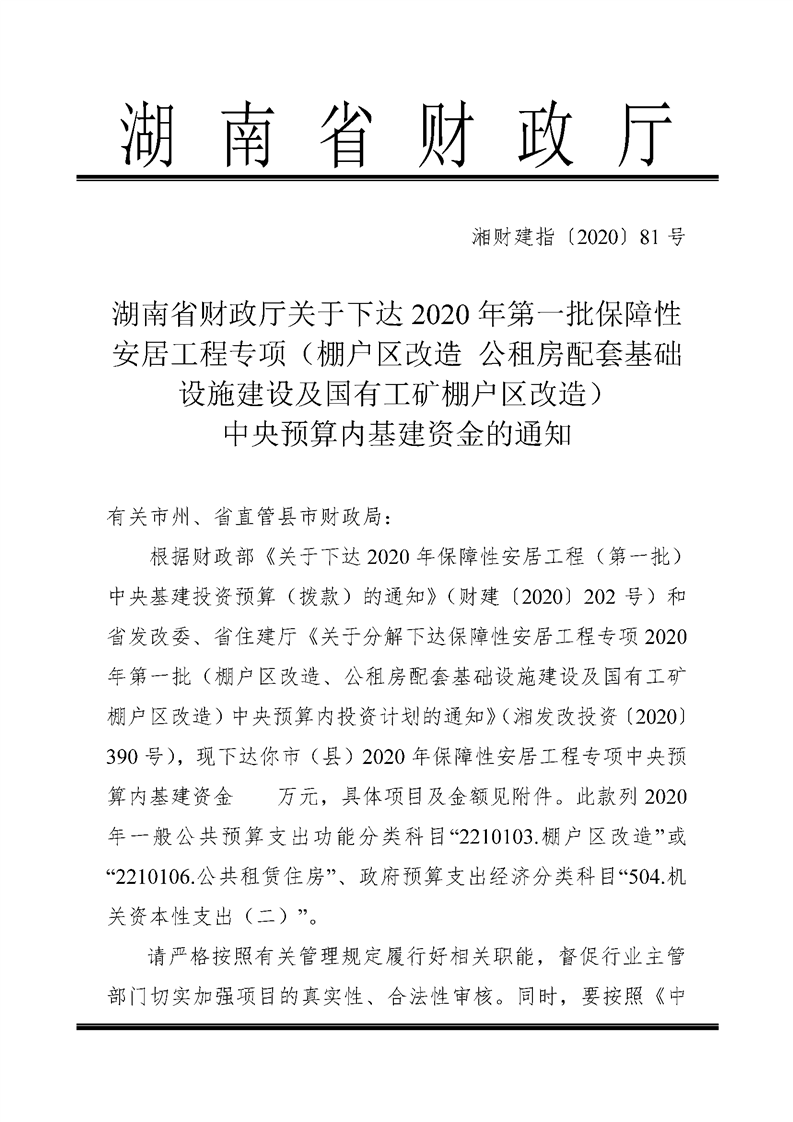 湖南省财政厅关于下达2020年第一批保障性安居工程专项(棚户区改造、公租房配套基础设施建设及国有工矿棚户区改造)中央预算内基建资金的通知