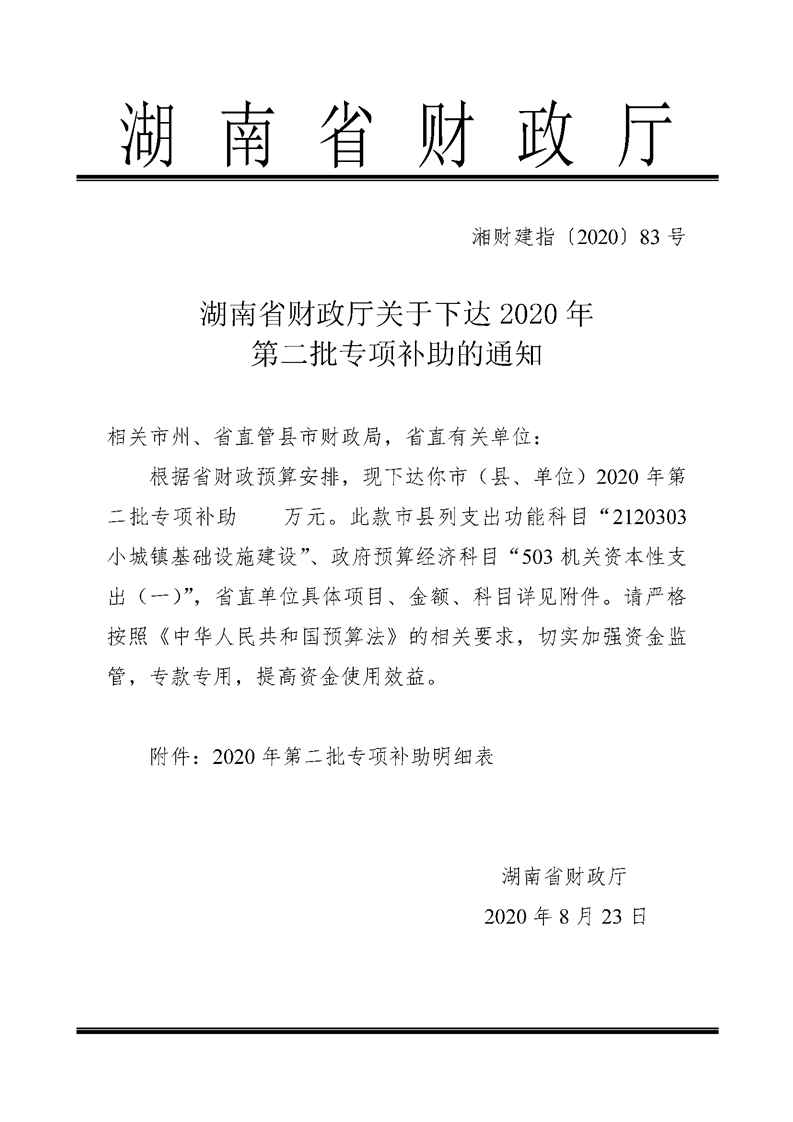 湖南省财政厅关于下达2020年第二批专项补助的通知