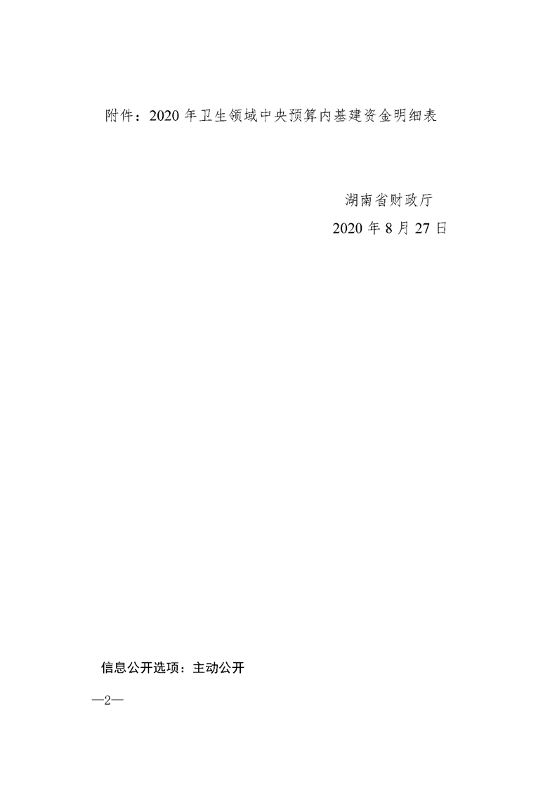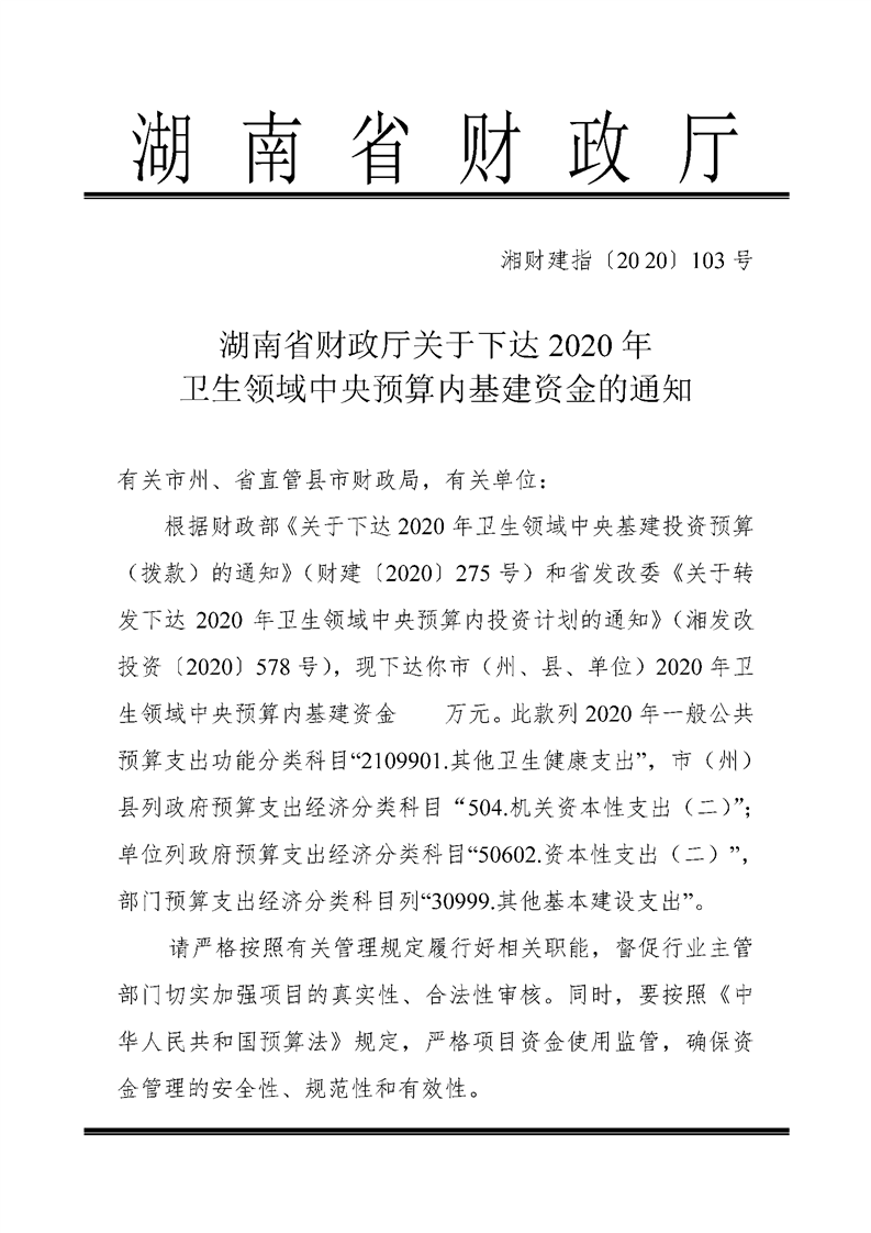 湖南省财政厅关于下达2020年卫生领域中央预算内基建资金的通知