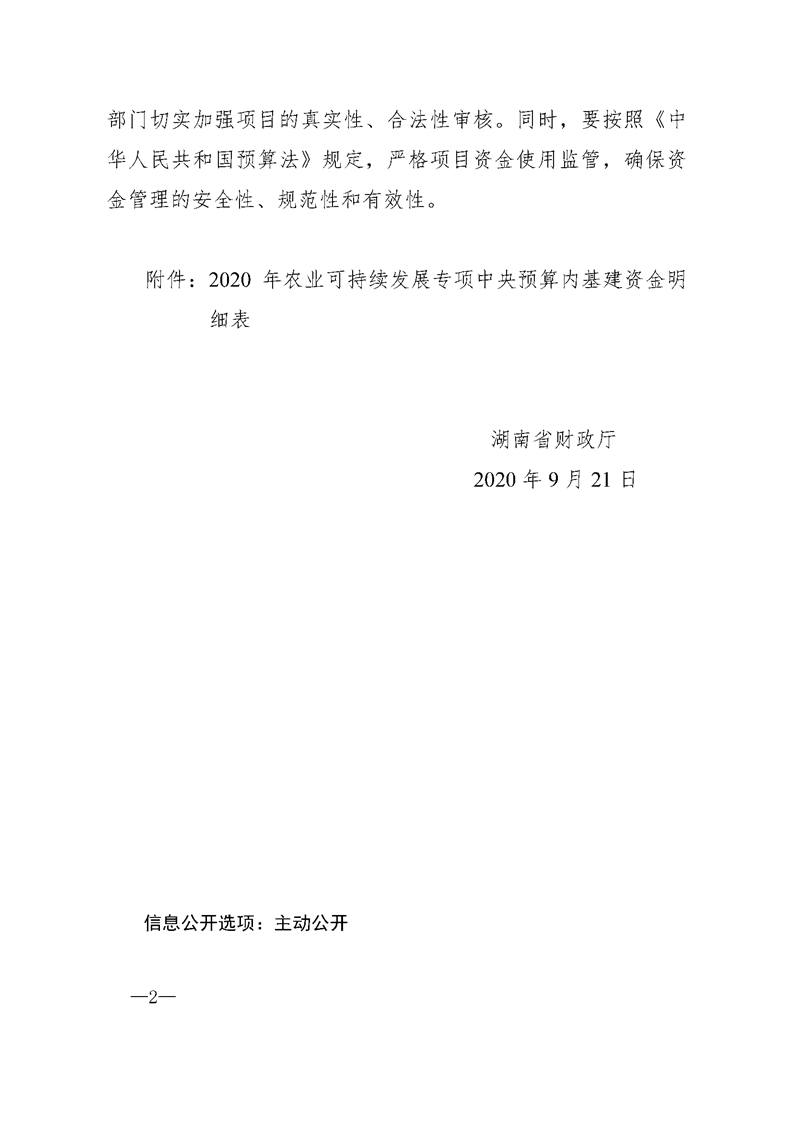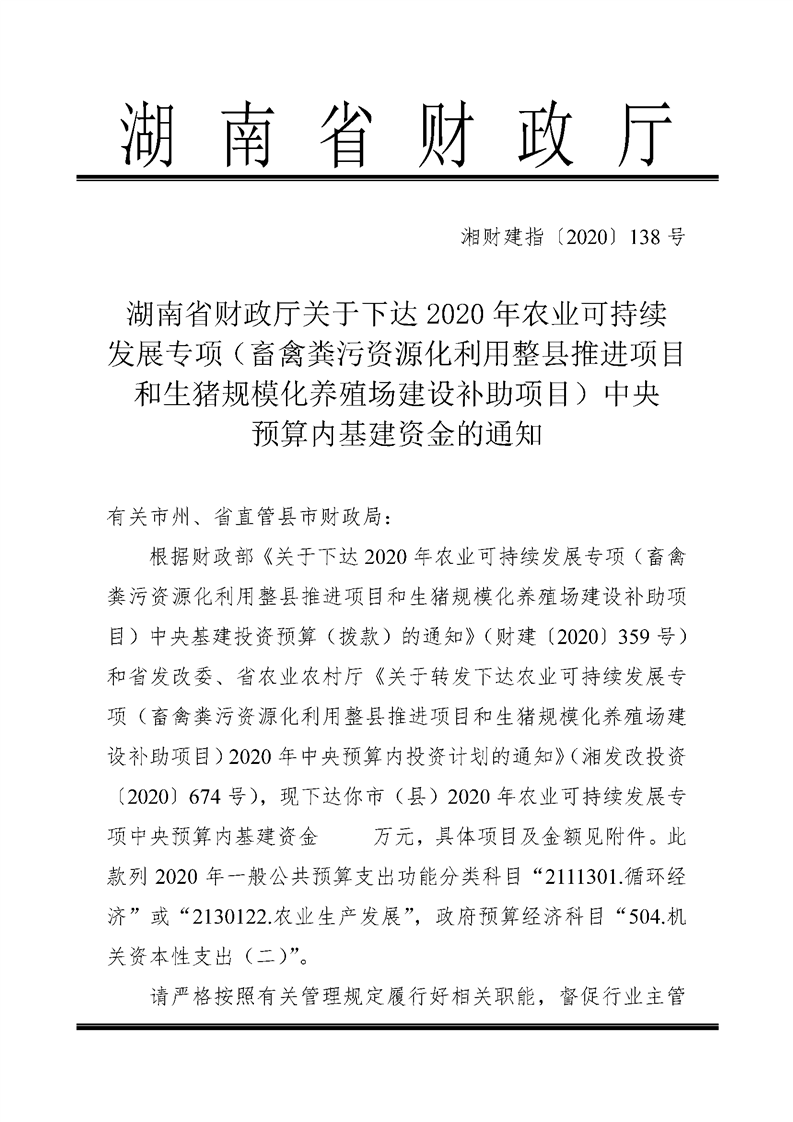 湖南省财政厅关于下达2020年农业可持续发展专项(畜禽粪污资源化利用整县推进项目和生猪规模化养殖场建设补助项目)中央预算内基建资金的通知