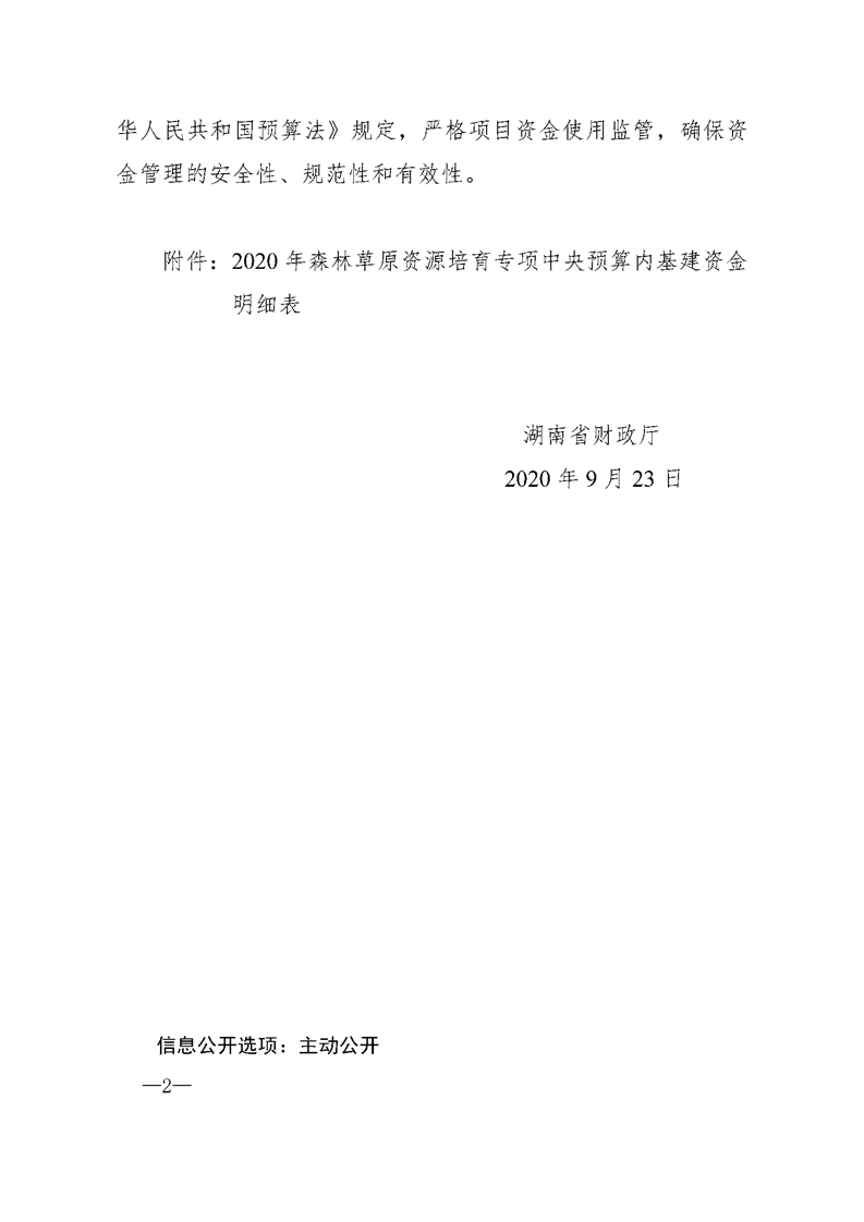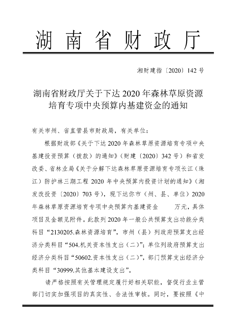 湖南省财政厅关于下达2020年森林草原资源培育专项中央预算内基建资金的通知