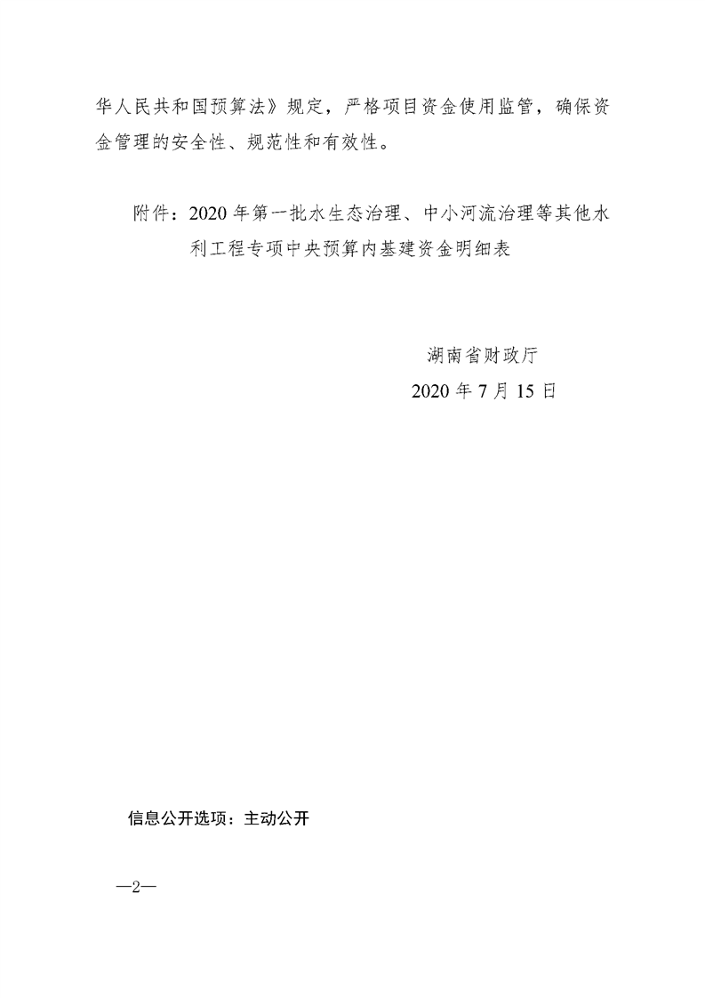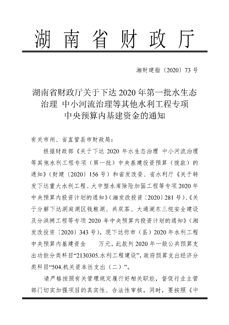 湖南省财政厅关于下达2020年第一批水生态治理 中小河流治理等其他水利工程专项中央预算内基建资金的通知