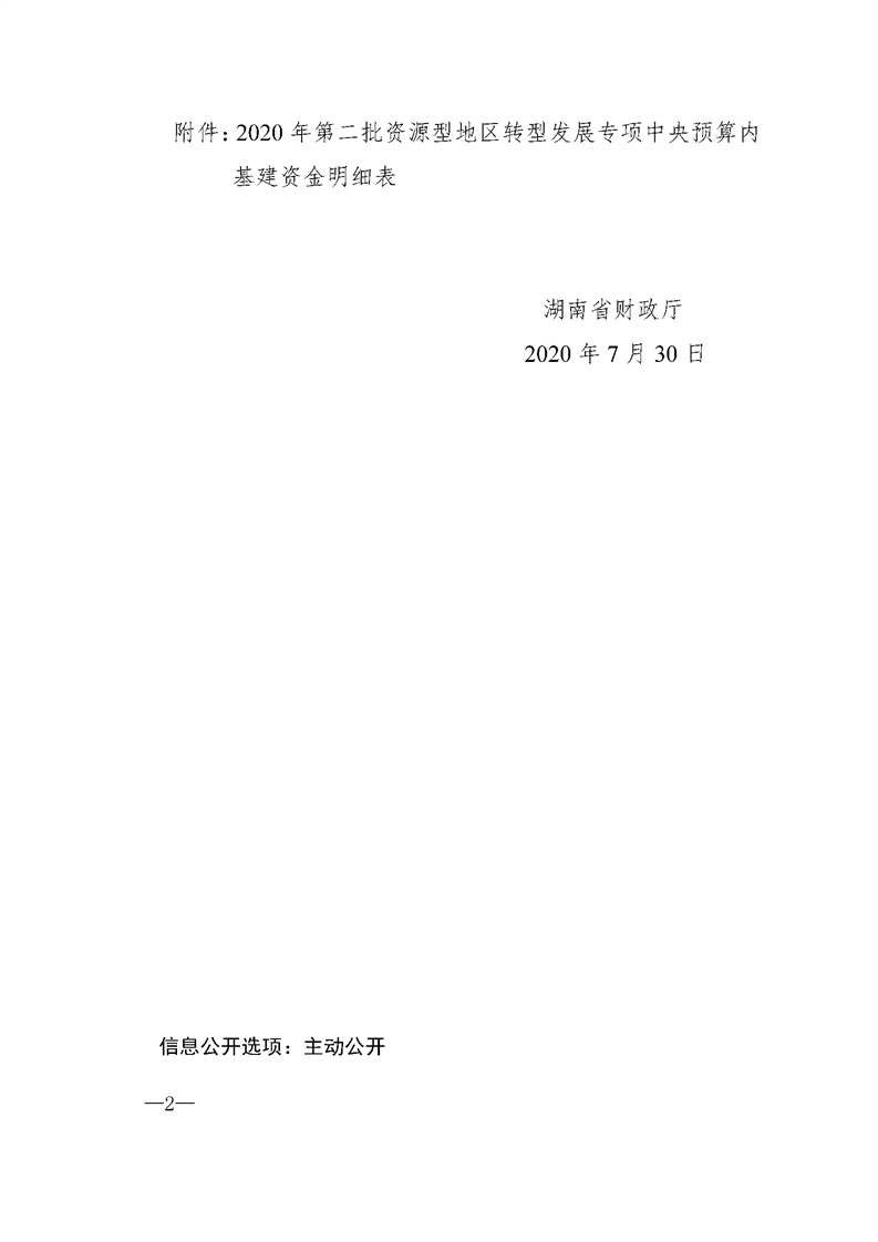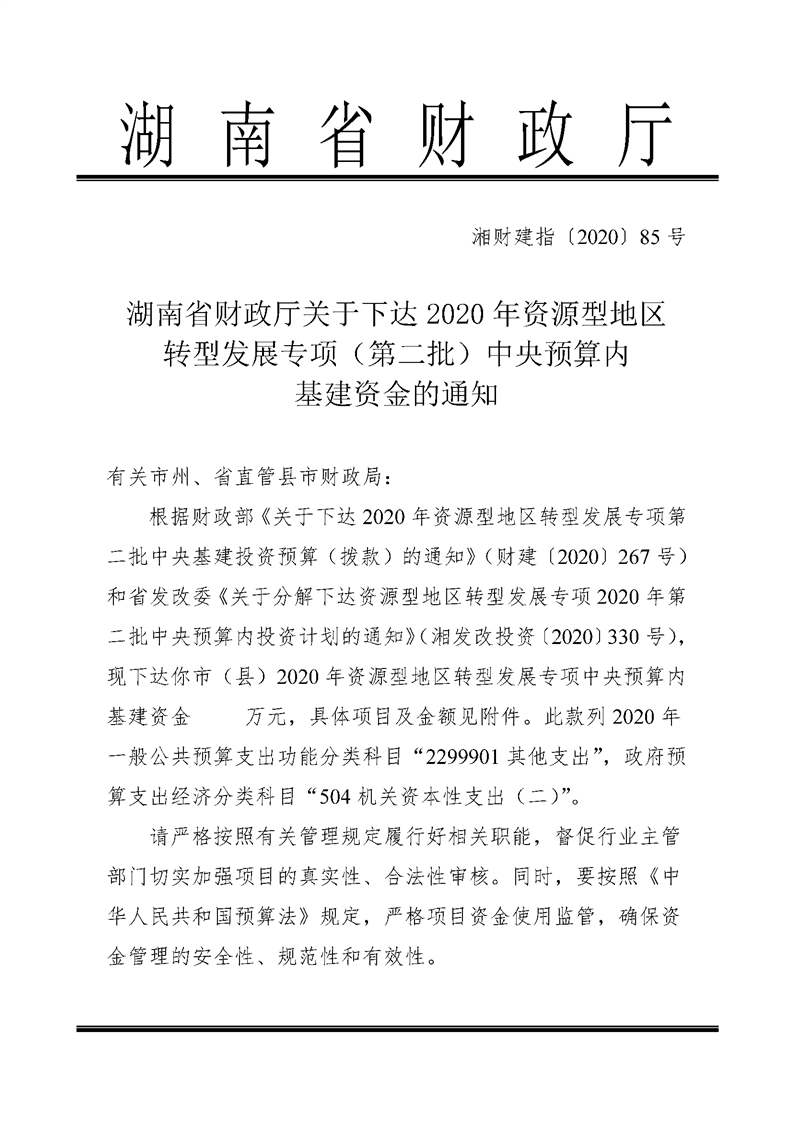 湖南省财政厅关于下达2020年资源型地区转型发展专项(第二批)中央预算内基建资金的通知