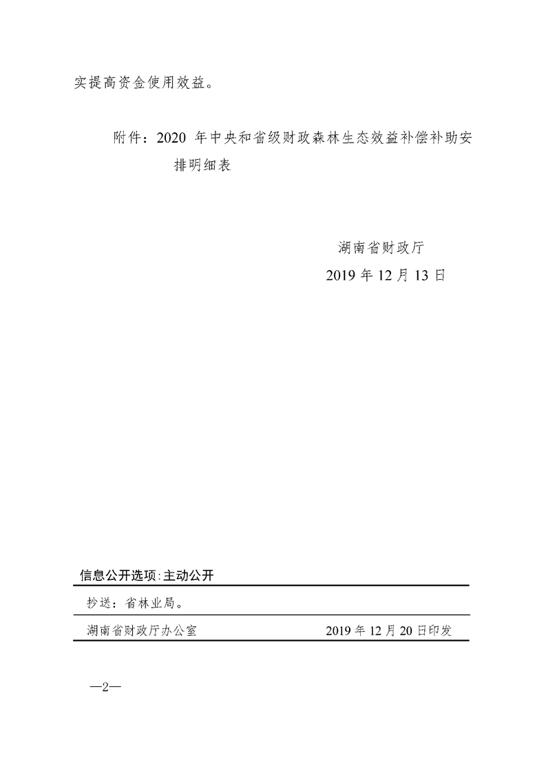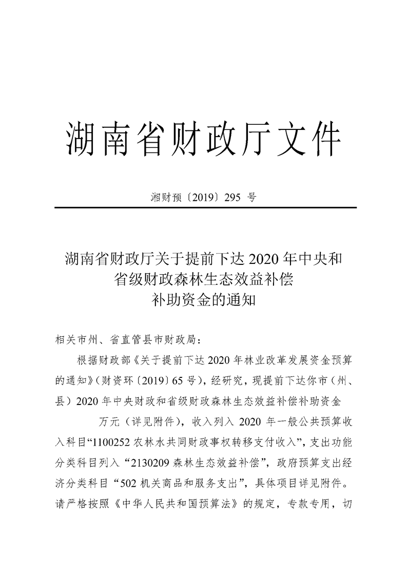 湖南省财政厅关于提前下达2020年中央和省级财政森林生态效益补偿补助资金的通知