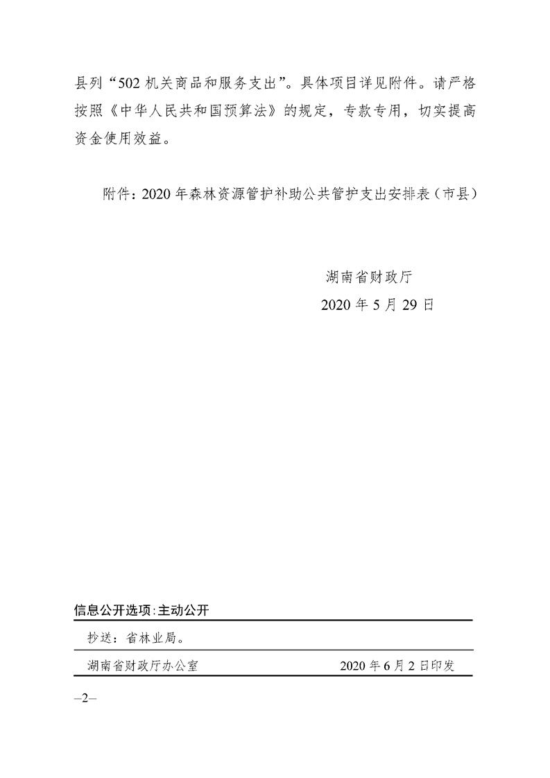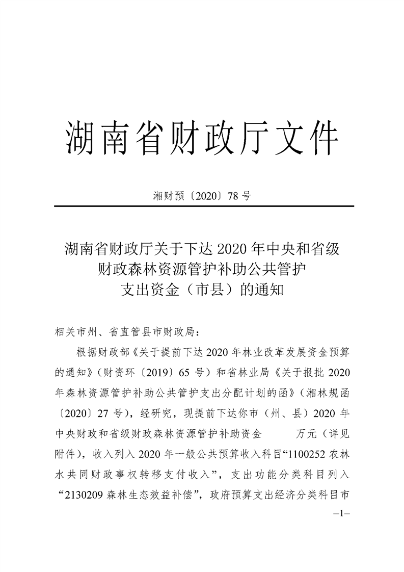 湖南省财政厅关于下达2020年中央和省级财政森林资源管护补助公共管护支出资金(市县)的通知