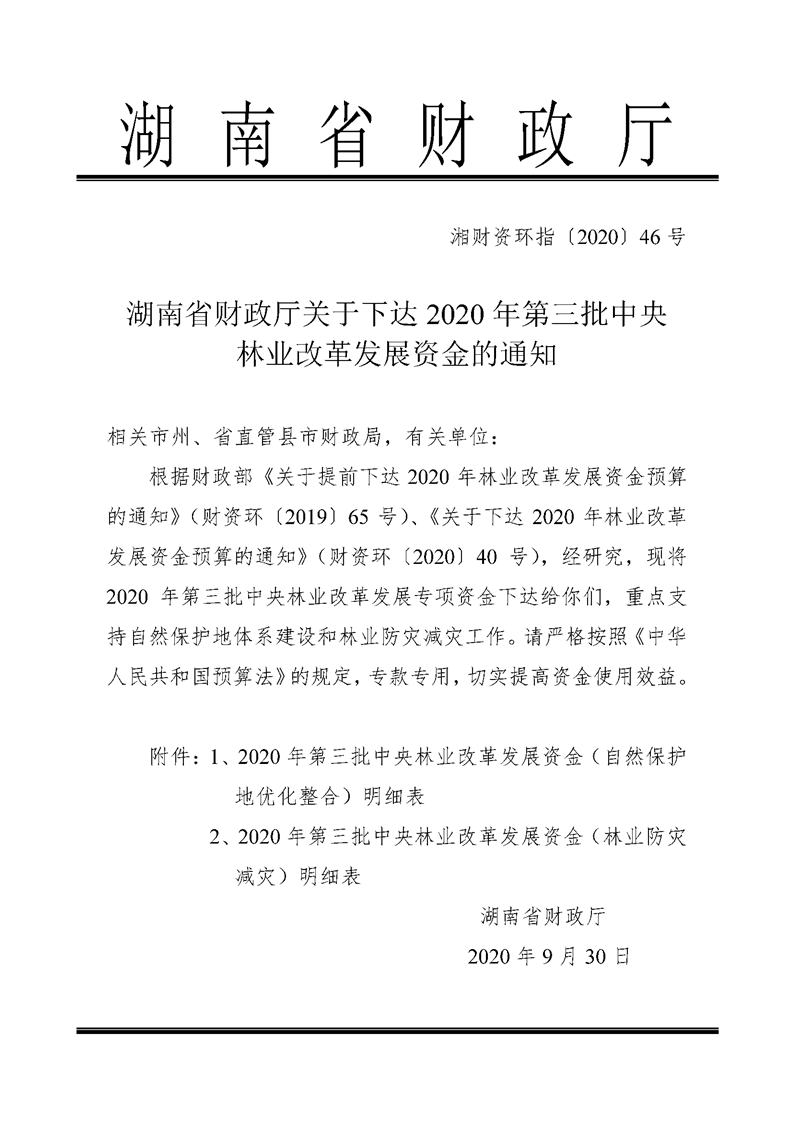 湖南省财政厅关于下达2020年第三批中央林业改革发展资金的通知