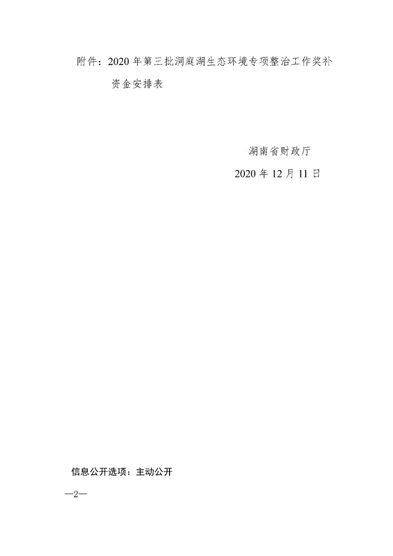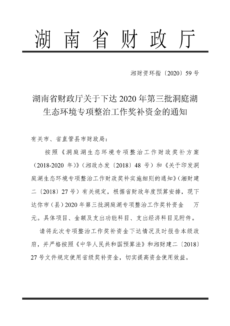湖南省财政厅关于下达2020年第三批洞庭湖生态环境专项整治工作奖补资金的通知