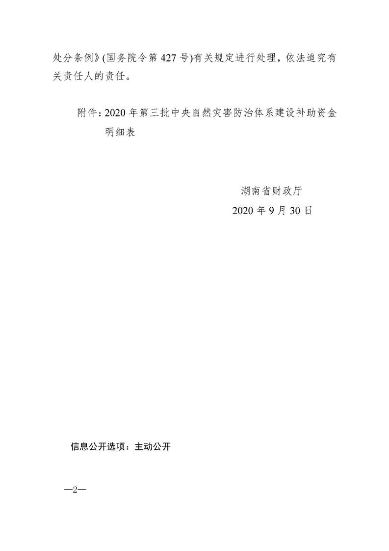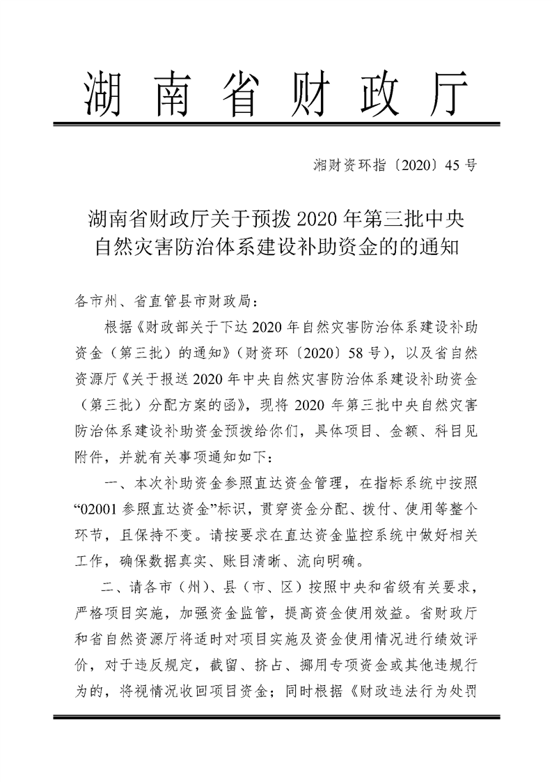 湖南省财政厅关于预拨2020年第三批中央自然灾害防治体系建设补助资金的通知