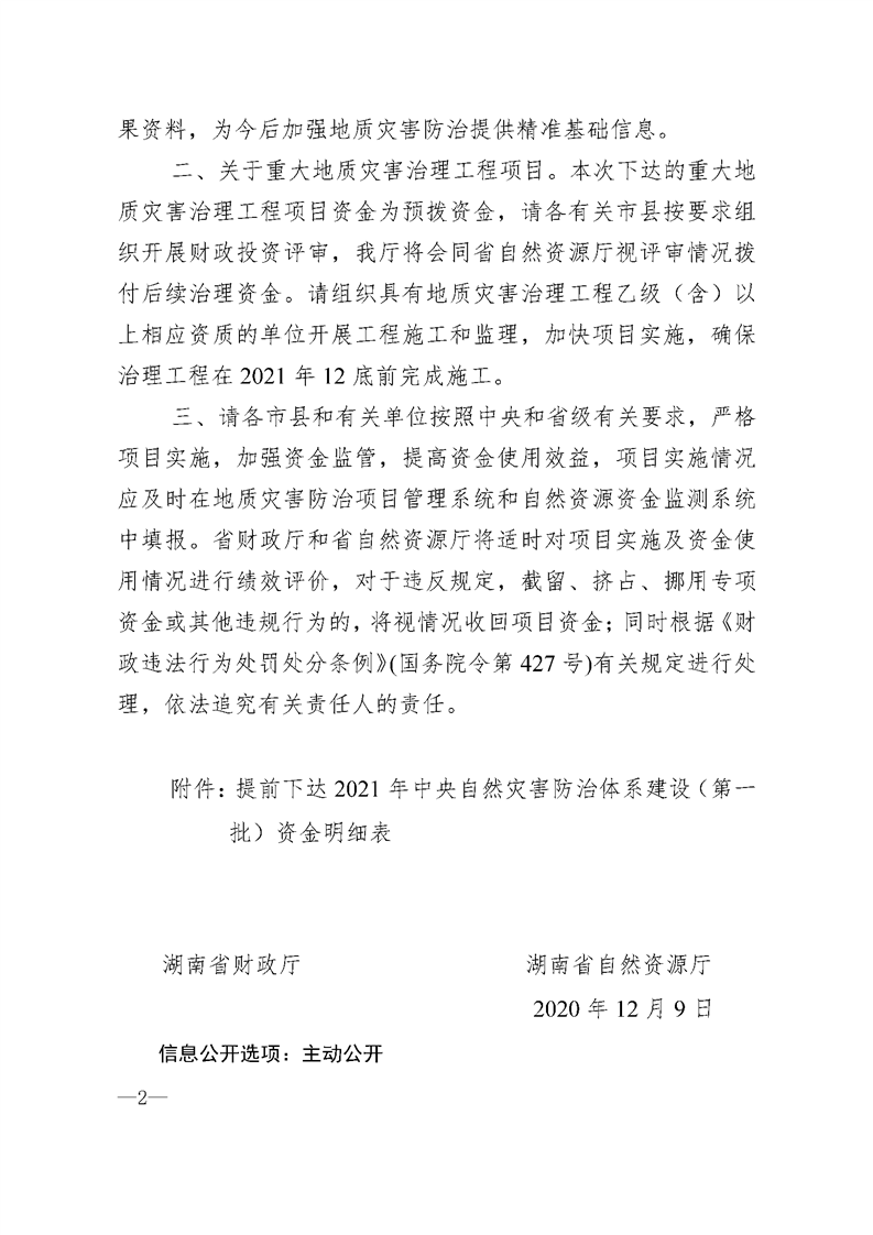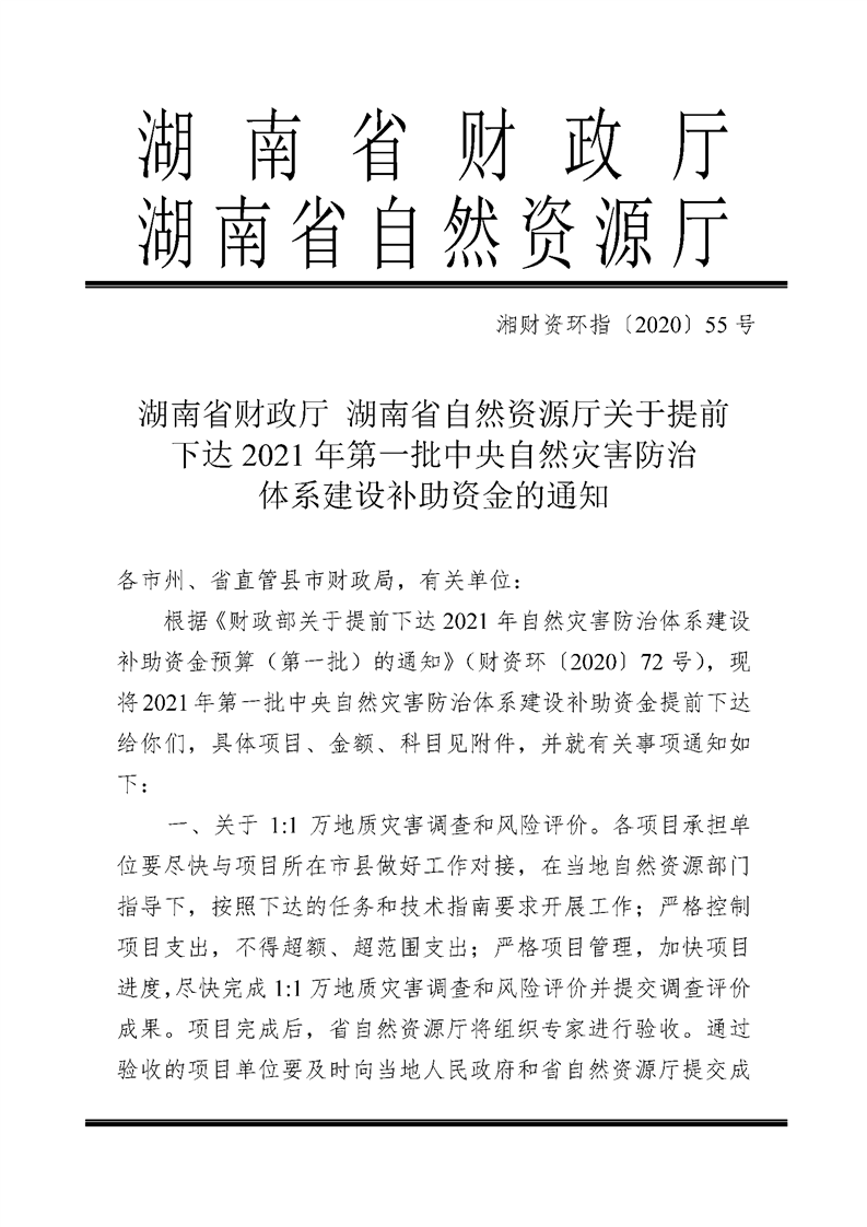 湖南省财政厅 湖南省自然资源厅关于提前下达2021年第一批中央自然灾害防治体系建设补助资金的通知