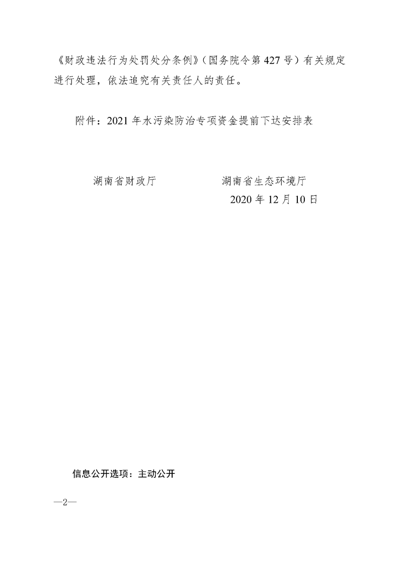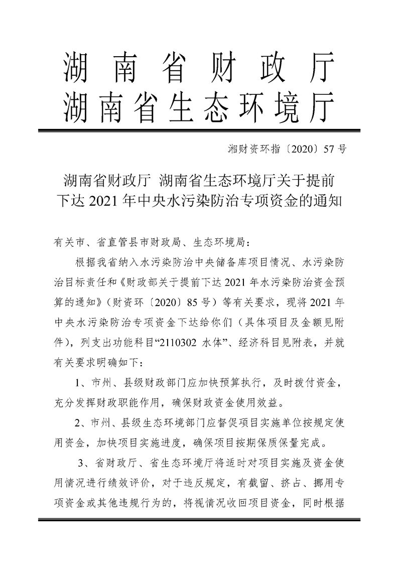 湖南省财政厅 湖南省生态环境厅关于提前下达2021年中央水污染防治专项资金的通知