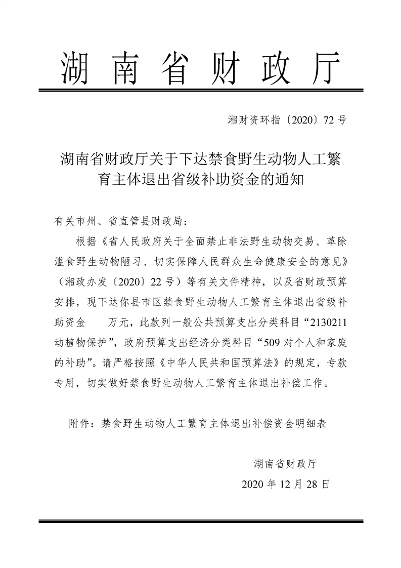 湖南省财政厅关于下达禁食野生动物人工繁育主体退出省级补助资金的通知