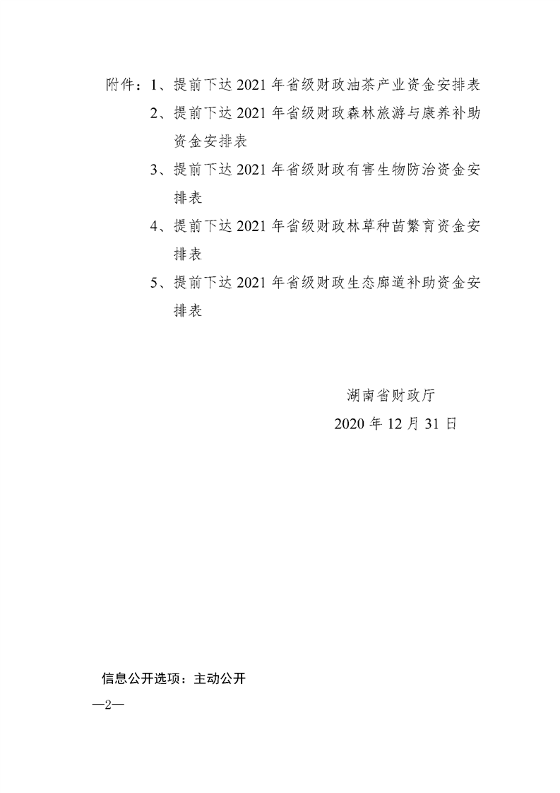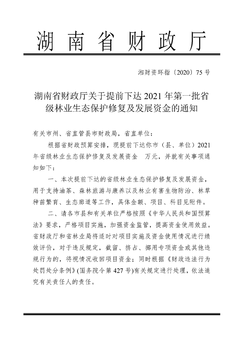 湖南省财政厅关于提前下达2021年第一批省级林业生态保护修复及发展资金的通知